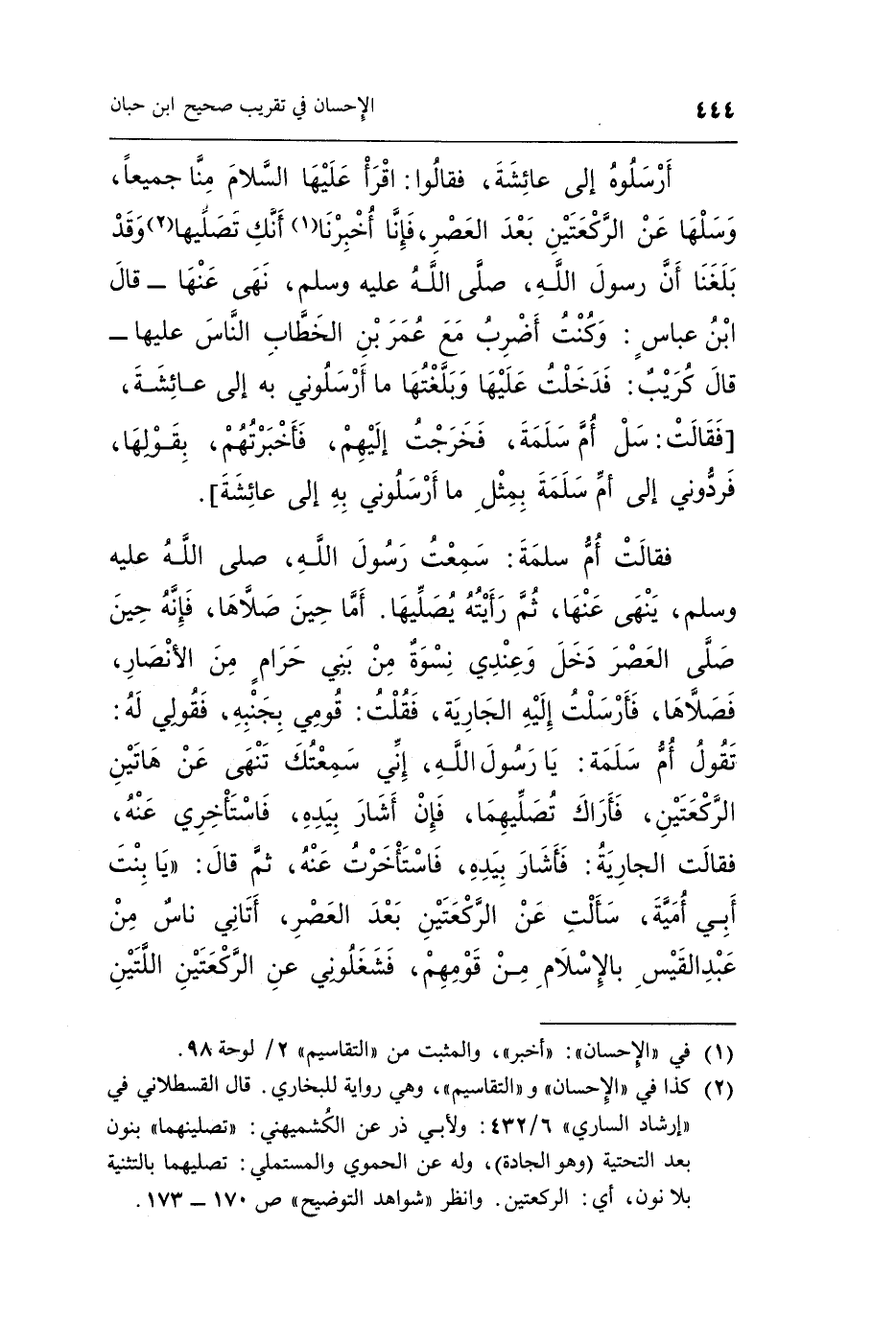 أَرْسَلُوهُ إِلَى عَائِشَةَ فَقَالُوا اقْرَأْ عَلَيْهَا السَّلَامَ مِنَّا جَمِيعًا وَسَلْهَا عَنِ الرَّكْعَتَيْنِ بَعْدَ الْعَصْرِ فَإِنَّا أُخْبِرْنَا1 أَنَّكِ تُصَلِّيهَا2 وَقَدْ بَلَغَنَا أَنَّ رَسُولَ اللَّهِ صَلَّى اللَّهُ عَلَيْهِ وَسَلَّمَ نَهَى عَنْهَا قَالَ ابْنُ عَبَّاسٍ وَكُنْتُ أَضْرِبُ مَعَ عُمَرَ بْنِ الْخَطَّابِ النَّاسَ عَلَيْهَا قَالَ كُرَيْبٌ فَدَخَلْتُ عَلَيْهَا وَبَلَّغْتُهَا مَا أَرْسَلُونِي بِهِ إِلَى عَائِشَةَ [فَقَالَتْ: سَلْ أُمَّ سَلَمَةَ فَخَرَجْتُ إِلَيْهِمْ فَأَخْبَرْتُهُمْ بِقَوْلِهَا فَرَدُّونِي إِلَى أُمِّ سَلَمَةَ بِمِثْلِ مَا أَرْسَلُونِي بِهِ إِلَى عَائِشَةَ] .