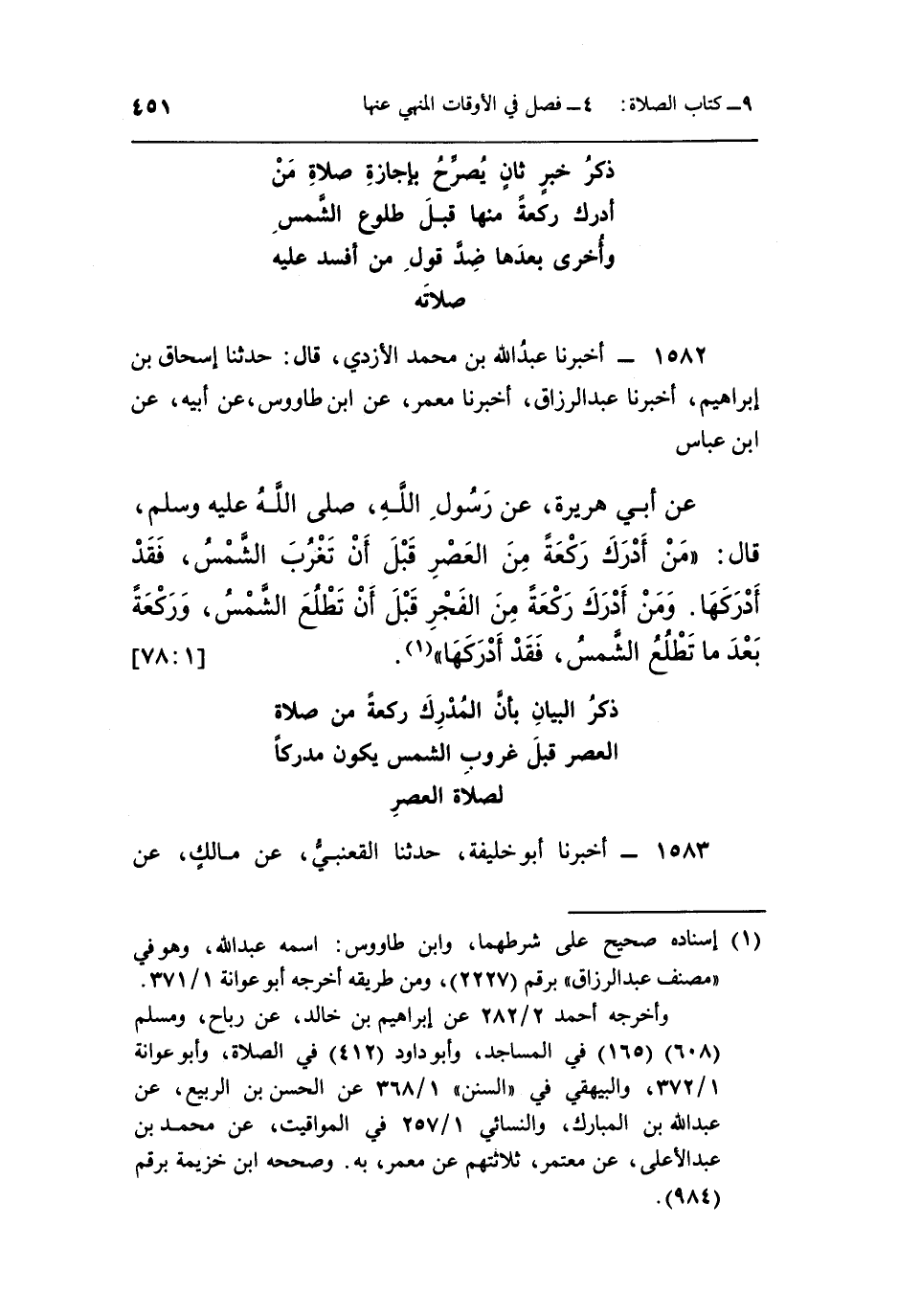 عَنْ أَبِي هُرَيْرَةَ عَنْ رَسُولِ اللَّهِ صَلَّى اللَّهُ عَلَيْهِ وَسَلَّمَ قَالَ: "مَنْ أَدْرَكَ رَكْعَةً مِنَ الْعَصْرِ قَبْلَ أَنْ تَغْرُبَ الشَّمْسُ فَقَدْ أَدْرَكَهَا وَمَنْ أَدْرَكَ رَكْعَةً مِنَ الْفَجْرِ قَبْلَ أَنْ تَطْلُعَ الشَّمْسُ وَرَكْعَةً بَعْدَ مَا تَطْلُعُ الشَّمْسُ فقد أدركها" 1.