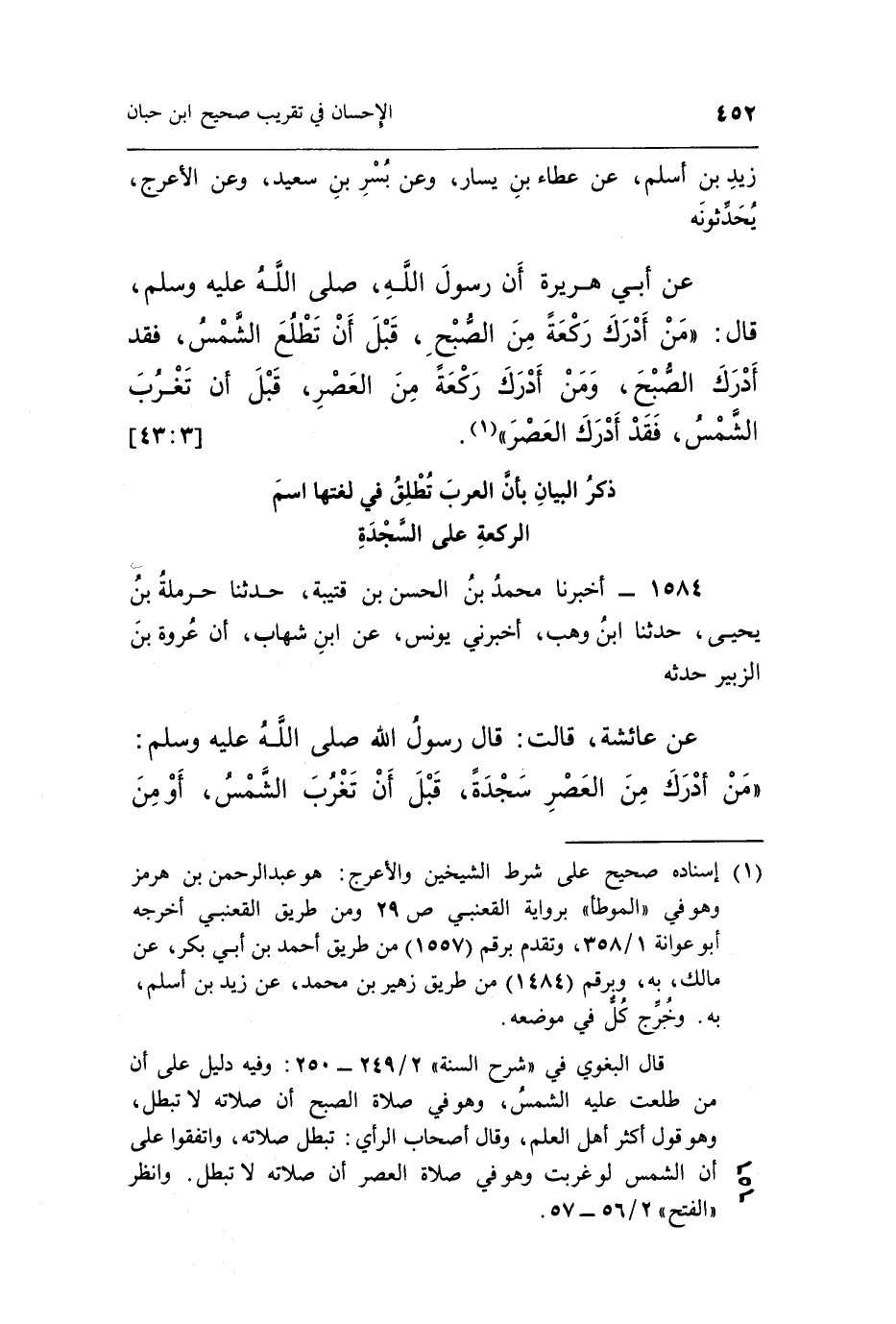 عَنْ أَبِي هُرَيْرَةَ أَنَّ رَسُولَ اللَّهِ صَلَّى اللَّهُ عَلَيْهِ وَسَلَّمَ قَالَ: "مَنْ أَدْرَكَ رَكْعَةً مِنَ الصُّبْحِ قَبْلَ أَنْ تَطْلُعَ الشَّمْسُ فَقَدْ أَدْرَكَ الصُّبْحَ وَمَنْ أَدْرَكَ رَكْعَةً مِنَ الْعَصْرِ قَبْلَ أَنْ تَغْرُبَ الشَّمْسُ فَقَدْ أَدْرَكَ الْعَصْرَ" 1.