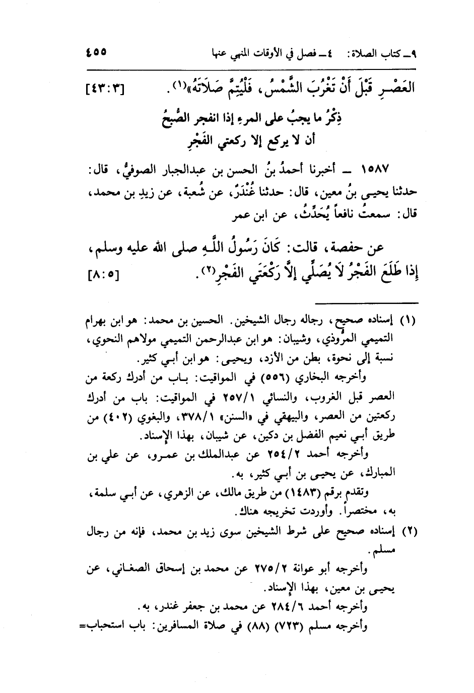 1587 - أَخْبَرَنَا أَحْمَدُ بْنُ الْحَسَنِ بْنِ عَبْدِ الْجَبَّارِ الصُّوفِيُّ قَالَ حَدَّثَنَا يَحْيَى بْنُ مَعِينٍ قَالَ حَدَّثَنَا غُنْدَرٌ عَنْ شُعْبَةَ عَنْ زَيْدِ بْنِ محمد قال سمعت نافعا يحدث عن بن عُمَرَ