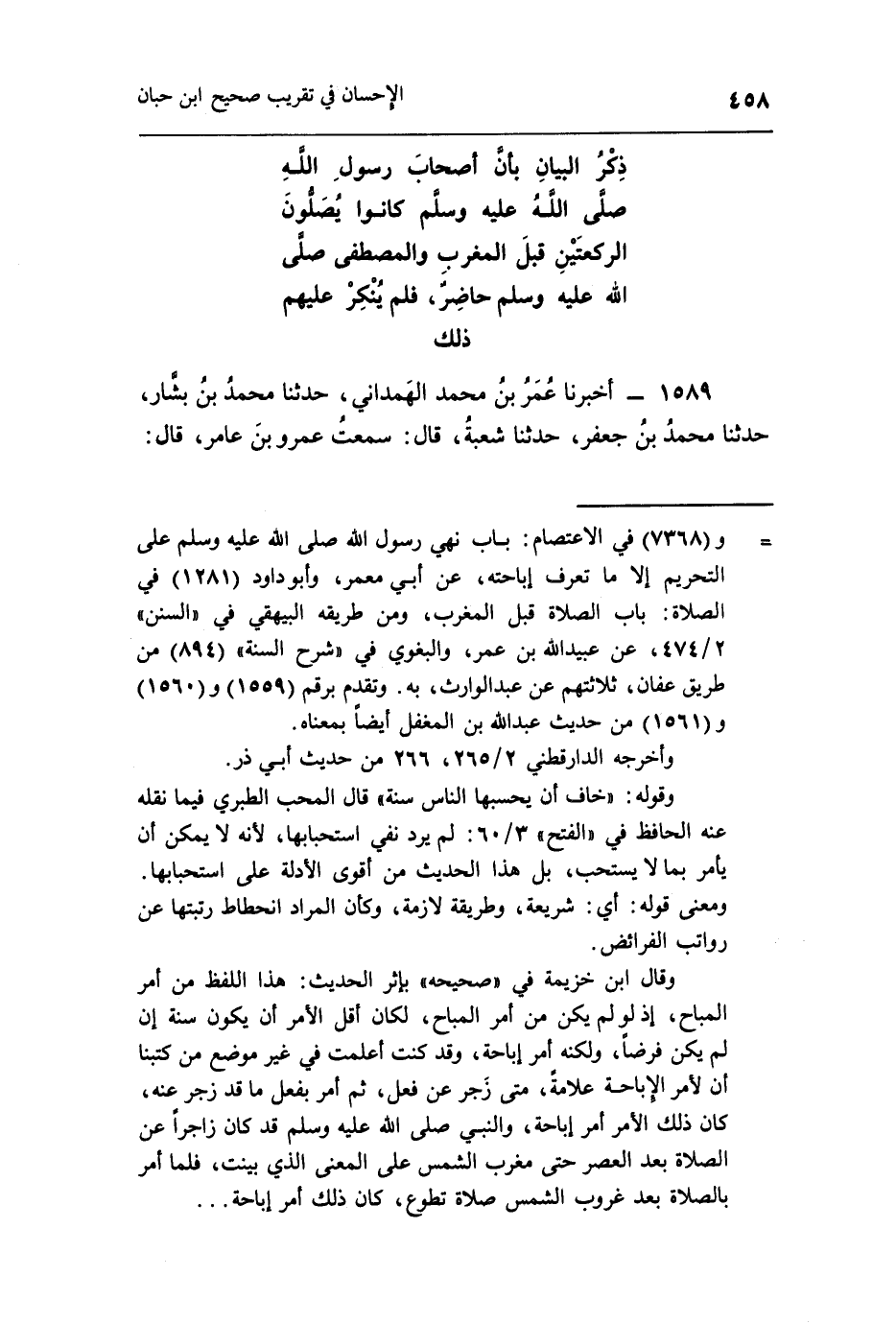 ذِكْرُ الْبَيَانِ بِأَنَّ أَصْحَابَ رَسُولِ اللَّهِ صَلَّى اللَّهُ عَلَيْهِ وَسَلَّمَ كَانُوا يُصَلُّونَ الرَّكْعَتَيْنِ قَبْلَ الْمَغْرِبِ وَالْمُصْطَفَى صَلَّى اللَّهُ عَلَيْهِ وَسَلَّمَ حَاضِرٌ فَلَمْ يُنْكِرْ عَلَيْهِمْ ذَلِكَ