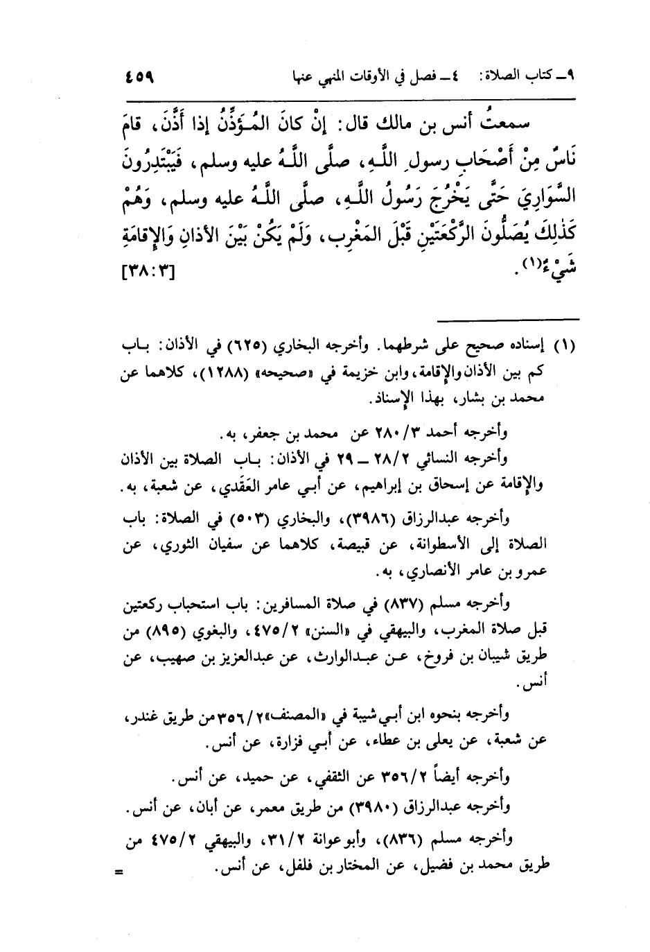 سَمِعْتُ أَنَسَ بْنَ مَالِكٍ قَالَ: إِنْ كَانَ الْمُؤَذِّنُ إِذَا أَذَّنَ قَامَ نَاسٌ مِنْ أَصْحَابِ رَسُولِ اللَّهِ صَلَّى اللَّهُ عَلَيْهِ وَسَلَّمَ فَيَبْتَدِرُونَ السَّوَارِيَ حَتَّى يَخْرُجَ رَسُولُ اللَّهِ صَلَّى اللَّهُ عَلَيْهِ وَسَلَّمَ وَهُمْ كَذَلِكَ يُصَلُّونَ الرَّكْعَتَيْنِ قَبْلَ الْمَغْرِبِ وَلَمْ يَكُنْ بَيْنَ الْأَذَانِ وَالْإِقَامَةِ شَيْءٌ1.