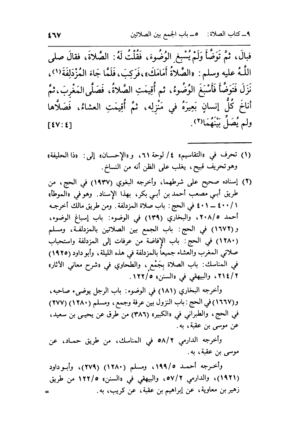 2 إسناده صحيح على شرطهما، وأخرجه البغوي [1937] في الحج، من طريق أبي مصعب أحمد بن أبي بكر، بهذا الإسناد. وهو في "الموطأ" 1/400-401 في الحج: باب صلاة المزدلفة. ومن طريق مالك أخرجه أحمد 5/208، والبخاري [139] في الوضوء: باب إسباغ الوضوء، و [1672] في الحج: باب الجمع بين الصلاتين بالمزدلفة، ومسلم [1280] في الحج: باب الإفاضة من عرفات إلى المزدلفة واستحباب صلاتي المغرب والعشاء جميعاً بالمزدلفة في هذه الليلة، وأبو داود [1925] في المناسك: باب الصلاة بجمع، والطحاوي في"شرح معاني الآثار" 2/214، والبيهقي في "السنن" 5/122.