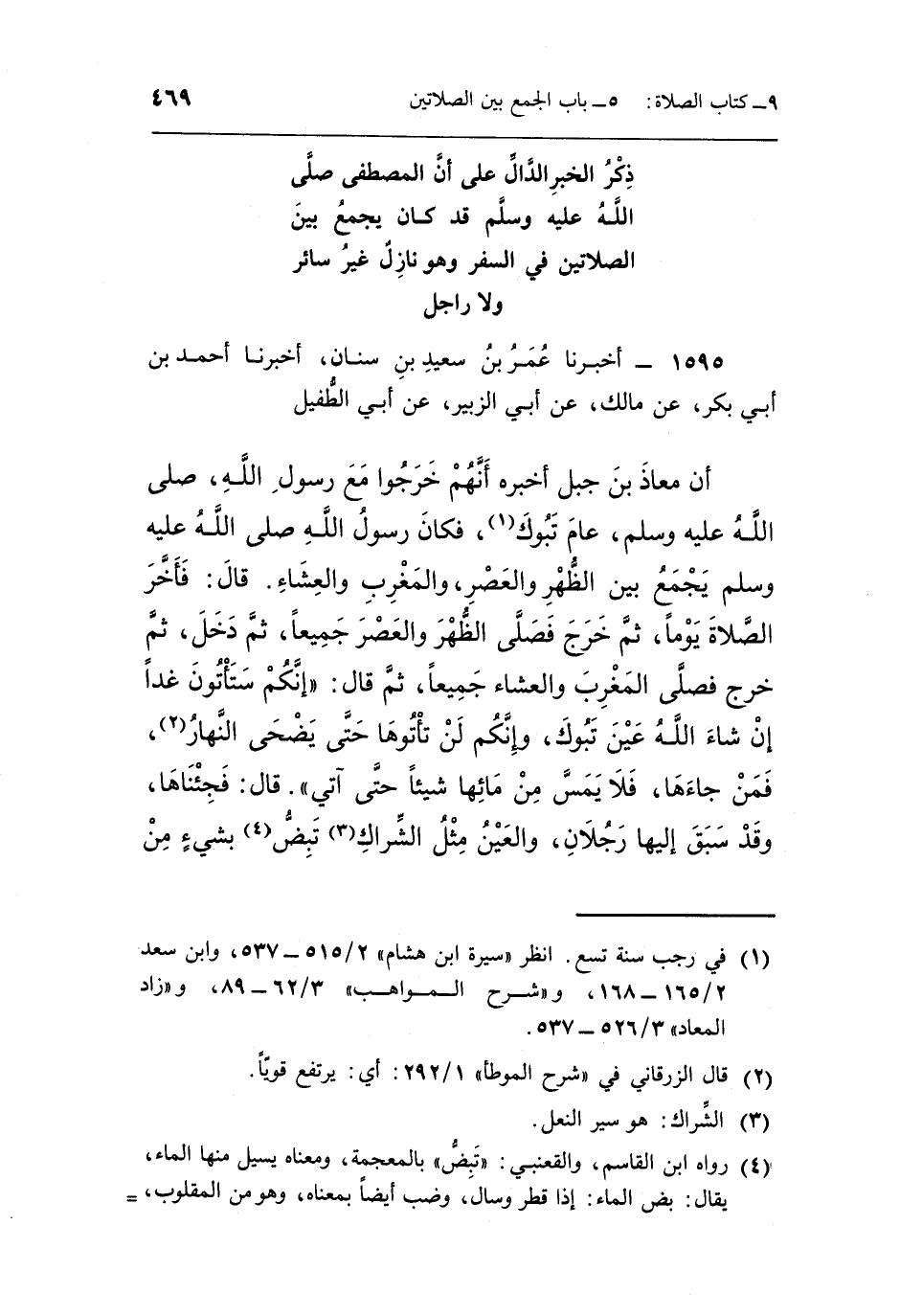 أَنَّ مُعَاذَ بْنَ جَبَلِ أَخْبَرَهُ أَنَّهُمْ خَرَجُوا مَعَ رَسُولِ اللَّهِ صَلَّى اللَّهُ عَلَيْهِ وَسَلَّمَ عَامَ تَبُوكَ1 فَكَانَ رَسُولُ اللَّهِ صَلَّى اللَّهُ عَلَيْهِ وَسَلَّمَ يَجْمَعُ بَيْنَ الظُّهْرِ وَالْعَصْرِ وَالْمَغْرِبِ وَالْعِشَاءِ قَالَ فَأَخَّرَ الصَّلَاةَ يَوْمًا ثُمَّ خَرَجَ فَصَلَّى الظُّهْرَ وَالْعَصْرَ جَمِيعًا ثُمَّ دَخَلَ ثُمَّ خَرَجَ فَصَلَّى الْمَغْرِبَ وَالْعِشَاءَ جَمِيعًا ثُمَّ قَالَ: "إِنَّكُمْ سَتَأْتُونَ غَدًا إِنْ شَاءَ اللَّهُ عَيْنَ تَبُوكَ وَإِنَّكُمْ لَنْ تَأْتُوهَا حَتَّى يَضْحَى النَّهَارُ2 فَمَنْ جَاءَهَا فَلَا يَمَسَّ مِنْ مَائِهَا شَيْئًا حَتَّى آتِيَ". قَالَ فَجِئْنَاهَا وَقَدْ سَبَقَ إِلَيْهَا رَجُلَانِ وَالْعَيْنُ مِثْلُ الشِّرَاكِ3 تَبِضُّ4 بِشَيْءٍ مِنْ