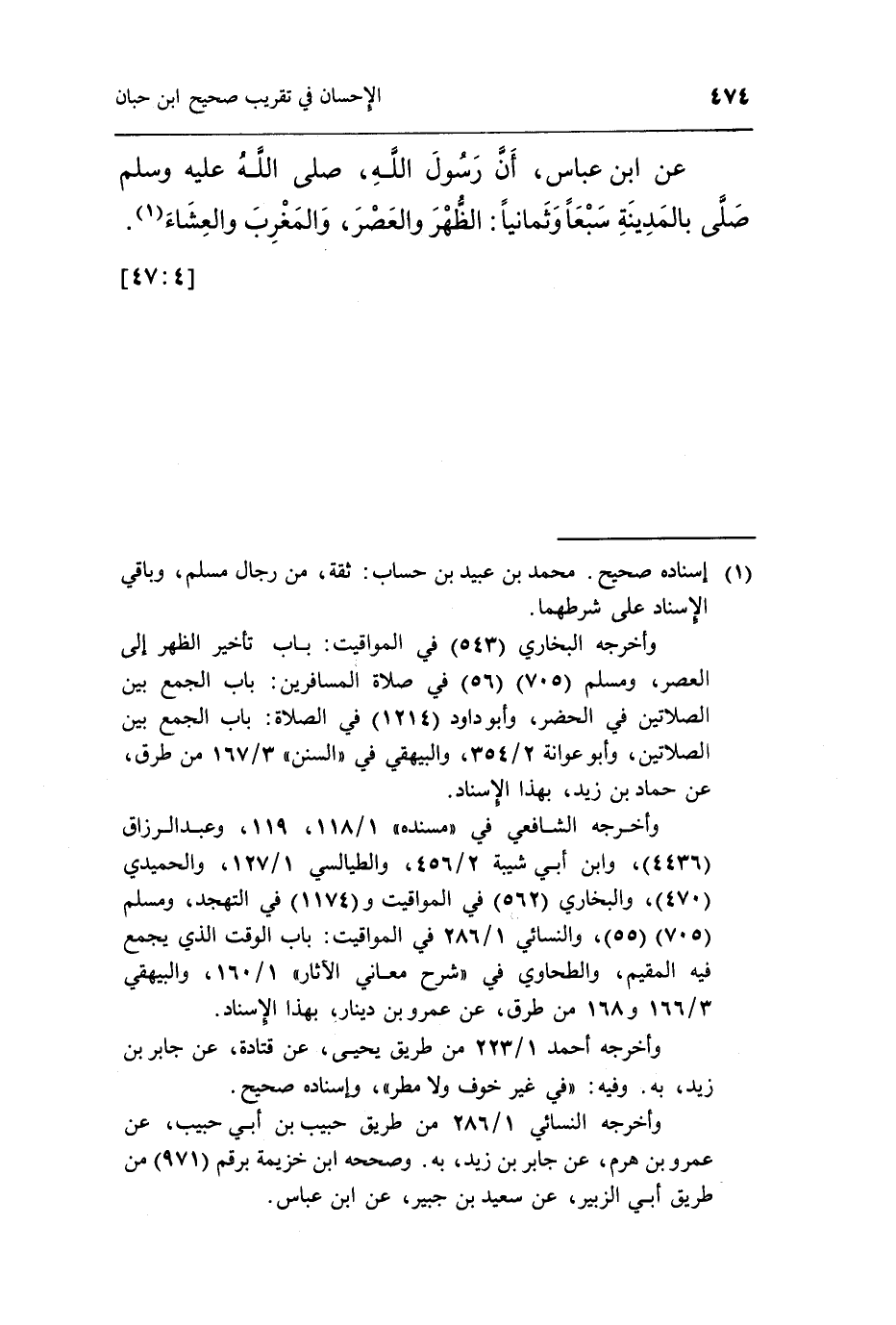 عَنِ ابْنِ عَبَّاسٍ أَنَّ رَسُولَ اللَّهِ صَلَّى اللَّهُ عَلَيْهِ وَسَلَّمَ صَلَّى بِالْمَدِينَةِ سَبْعًا وَثَمَانِيًا الظهر والعصر والمغرب والعشاء1.