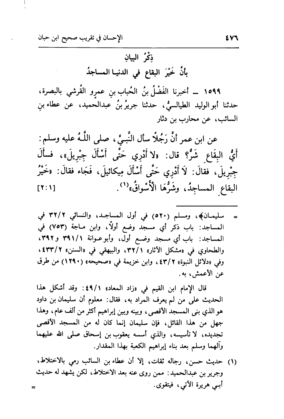 1599 - أَخْبَرَنَا الْفَضْلُ بْنُ الْحُبَابِ بْنِ عَمْرٍو الْقُرَشِيُّ بِالْبَصْرَةِ حَدَّثَنَا أَبُو الْوَلِيدِ الطَّيَالِسِيُّ حَدَّثَنَا جَرِيرُ بْنُ عَبْدِ الْحَمِيدِ عَنْ عَطَاءِ بْنِ السائب عن محارب بن دثار