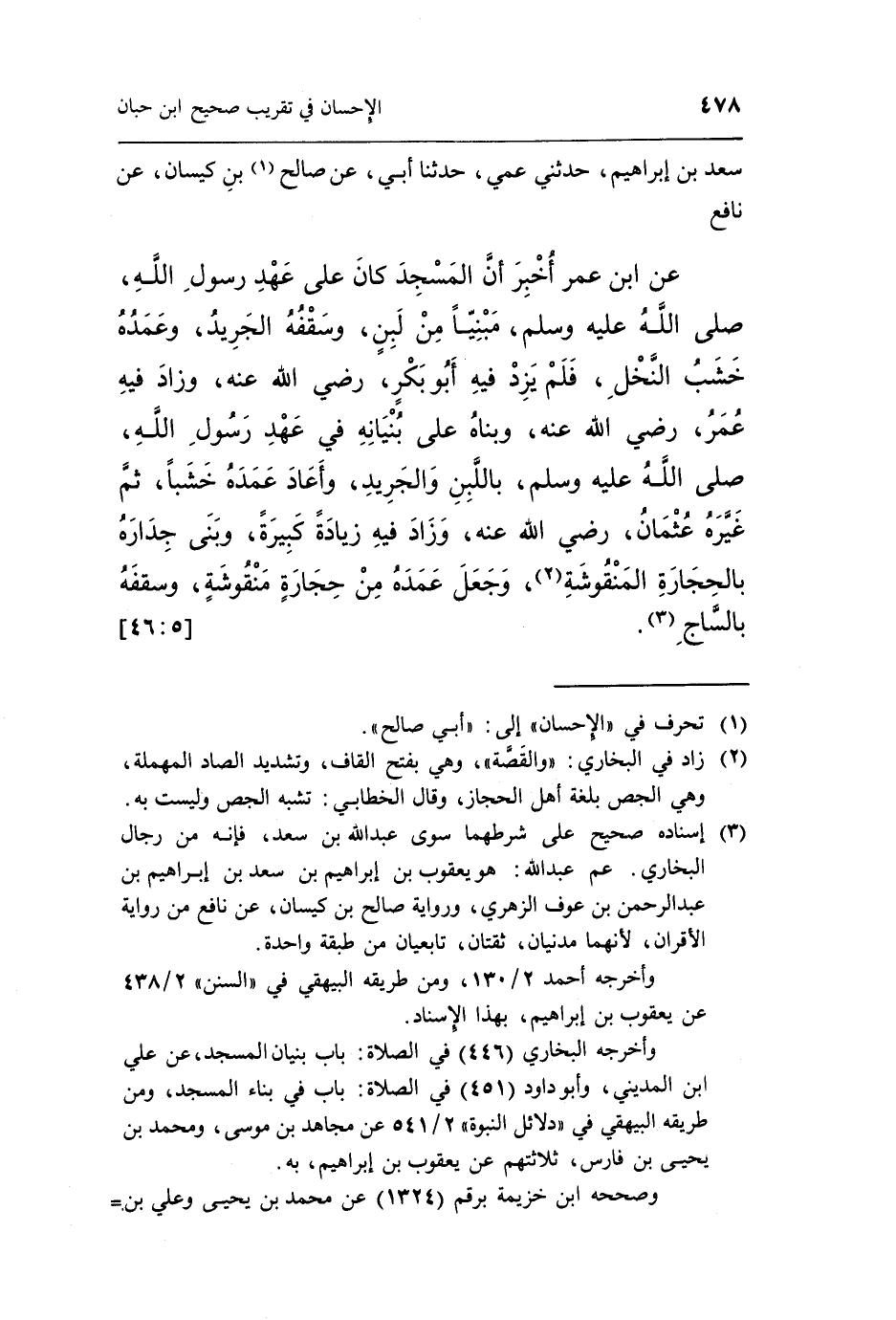 عَنِ بن عُمَرَ أَخْبَرَ أَنَّ الْمَسْجِدَ كَانَ عَلَى عَهْدِ رَسُولِ اللَّهِ صَلَّى اللَّهُ عَلَيْهِ وَسَلَّمَ مَبْنِيًّا مِنْ لَبِنٍ وَسَقْفُهُ الْجَرِيدُ وَعُمُدُهُ خَشَبُ النَّخْلِ فَلَمْ يَزِدْ فِيهِ أَبُو بَكْرٍ رَضِيَ اللَّهُ تعالى عنه وزاد فيه عمر رضى الله تعالى عَنْهُ وَبَنَاهُ عَلَى بُنْيَانِهِ فِي عَهْدِ رَسُولِ اللَّهِ صَلَّى اللَّهُ عَلَيْهِ وَسَلَّمَ بِاللَّبِنِ وَالْجَرِيدِ وَأَعَادَ عُمُدَهُ خَشَبًا ثُمَّ غَيَّرَهُ عُثْمَانُ رَضِيَ الله تعالى عَنْهُ وَزَادَ فِيهِ زِيَادَةً كَبِيرَةً وَبَنَى جِدَارَهُ بِالْحِجَارَةِ الْمَنْقُوشَةِ2 وَجَعَلَ عُمُدَهُ مِنْ حِجَارَةٍ مَنْقُوشَةٍ وسقفه بالساج3.