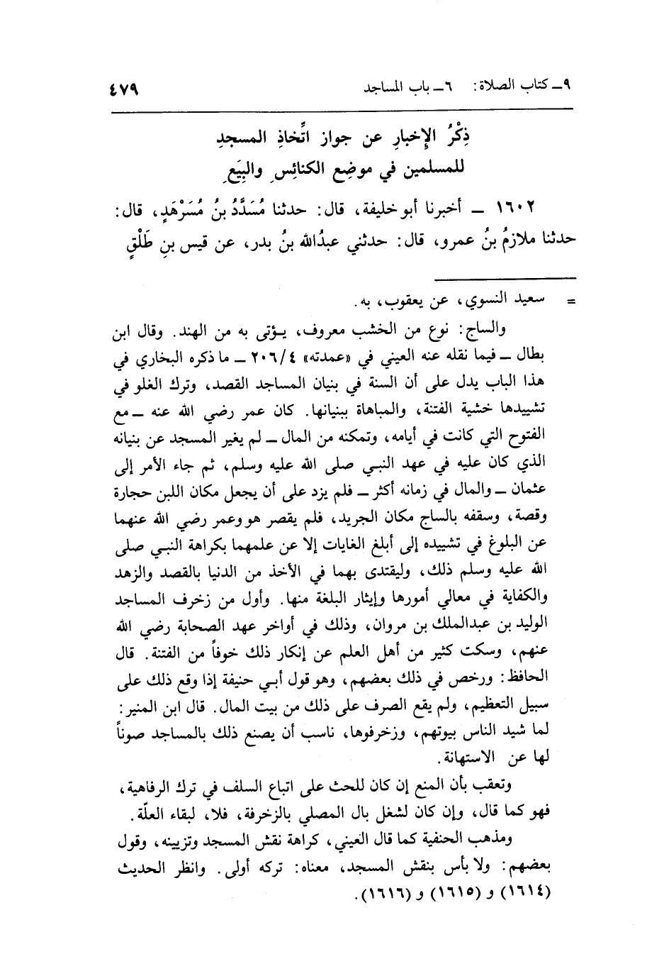 = والساج: نوع من الخشب معروف، يؤتى به من الهند. وقال ابن بطال –فيما نقله عنه العيني في "عمدته" 4/206- ما ذكره البخاري في هذا الباب يدل على أن السنة في بنيان المساجد القصد، وترك الغلو في تشييدها خشية الفتنة، والمباهاة ببنيانها. كان عمر رضي الله عنه-مع الفتوح التي كانت في أيامه، وتمكنه من المال- لم يغير المسجد عن بنيانه الذي كان عليه في عهد النبي صلى الله عليه وسلم، ثم جاء الأمر إلى عثمان-والمال في زمانه أكثر- فلم يزد على أن يجعل مكان اللبن حجارة وقصة، وسقفه بالساج مكان الجريد، فلم يقصر هو وعمر رضي الله عنهما عن البلوغ في تشييده إلى أبلغ الغايات إلا عن علمهما بكراهة النبي صلى الله عليه وسلم ذلك، وليقتدى بهما في الأخذ من الدنيا بالقصد والزهد والكفاية في معالي أمورها وإيثار البلغة منها. وأول من زخرف المساجد الوليد بن عبد الملك بن مروان، وذلك في أواخر عهد الصحابة رضي الله عنهم، وسكت كثير من أهل العلم عن إنكار ذلك خوفاً من الفتنة. قال الحافظ: ورخص في ذلك بعضهم، وهو قول أبي حنيفة إذا وقع ذلك على سبيل التعظيم، ولم يقع الصرف على ذلك من بيت المال. قال ابن المنير: لما شيد الناس بيوتهم، وزخرفوها، ناسب أن يصنع ذلك بالمساجد صوناً لها عن الاستهانة.