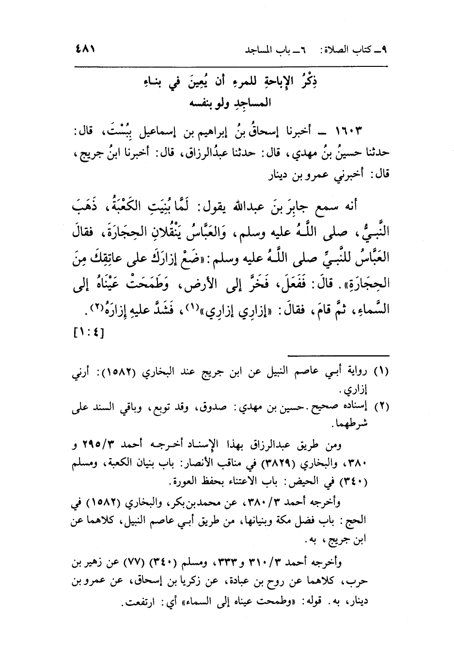 أَنَّهُ سَمِعَ جَابِرَ بْنَ عَبْدِ اللَّهِ يَقُولُ لَمَّا بُنِيَتِ الْكَعْبَةُ ذَهَبَ النَّبِيُّ صَلَّى اللَّهُ عَلَيْهِ وَسَلَّمَ وَالْعَبَّاسُ يَنْقُلَانِ الْحِجَارَةَ فَقَالَ الْعَبَّاسُ لِلنَّبِيِّ صَلَّى اللَّهُ عَلَيْهِ وَسَلَّمَ ضَعْ إِزَارَكَ عَلَى عَاتِقِكَ مِنَ الْحِجَارَةِ قَالَ فَفَعَلَ فَخَرَّ إِلَى الْأَرْضِ وَطَمَحَتْ عَيْنَاهُ إِلَى السَّمَاءِ ثُمَّ قَامَ فَقَالَ: "إِزَارِي إِزَارِي" 1 فَشَدَّ عليه إزاره2.