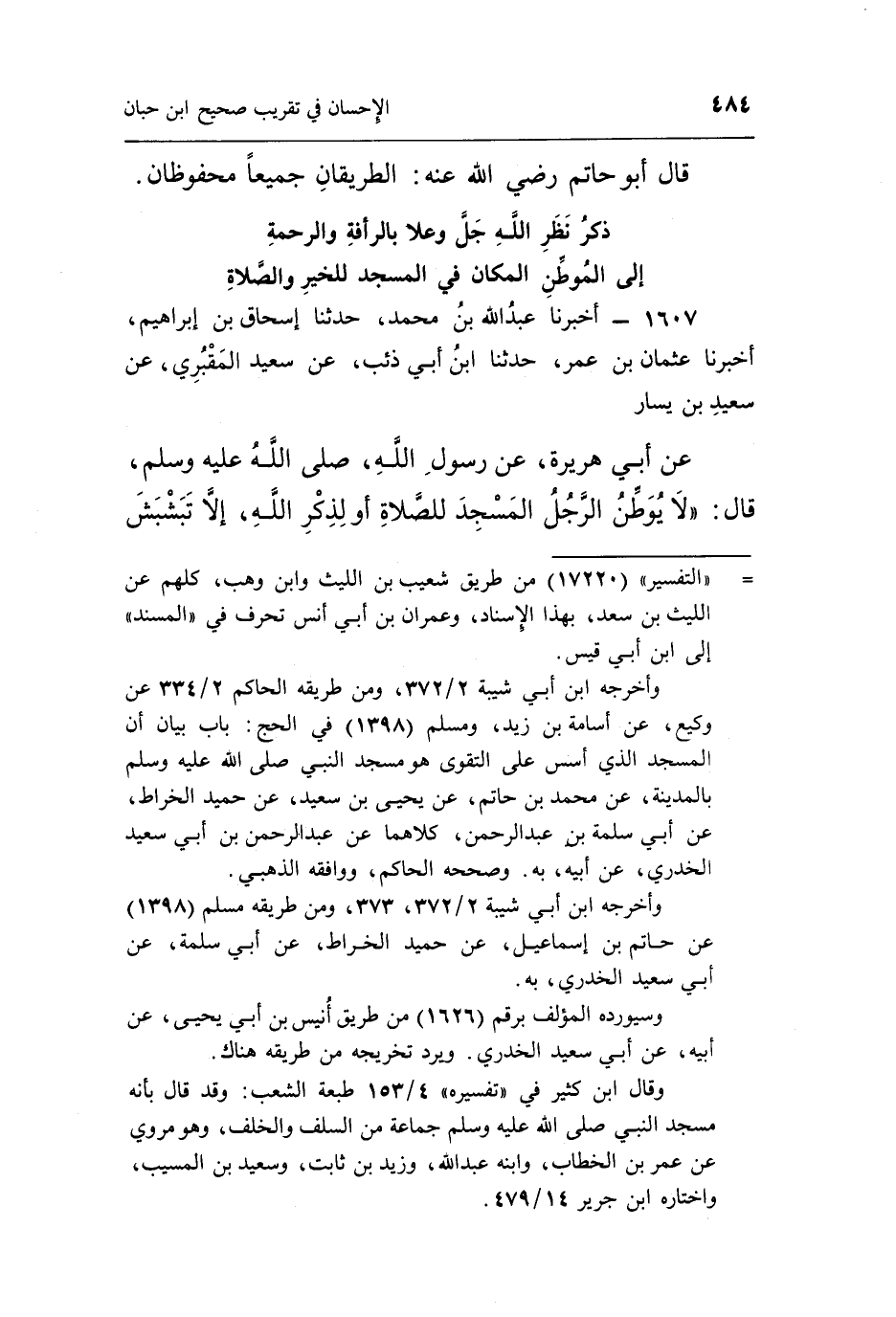 عَنْ أَبِي هُرَيْرَةَ عَنْ رَسُولِ اللَّهِ صَلَّى اللَّهُ عَلَيْهِ وَسَلَّمَ قَالَ: "لَا يُوَطِّنُ الرَّجُلُ الْمَسْجِدَ لِلصَّلَاةِ أَوْ لِذِكْرِ اللَّهِ إِلَّا تَبَشْبَشَ