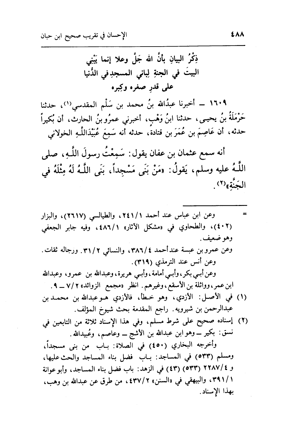 أَنَّهُ سَمِعَ عُثْمَانَ بْنَ عَفَّانَ يَقُولُ سَمِعْتُ رَسُولَ اللَّهِ صَلَّى اللَّهُ عَلَيْهِ وَسَلَّمَ يَقُولُ: "مَنْ بَنَى مَسْجِدًا بَنَى اللَّهُ لَهُ مِثْلَهُ فِي الجنة" 2.