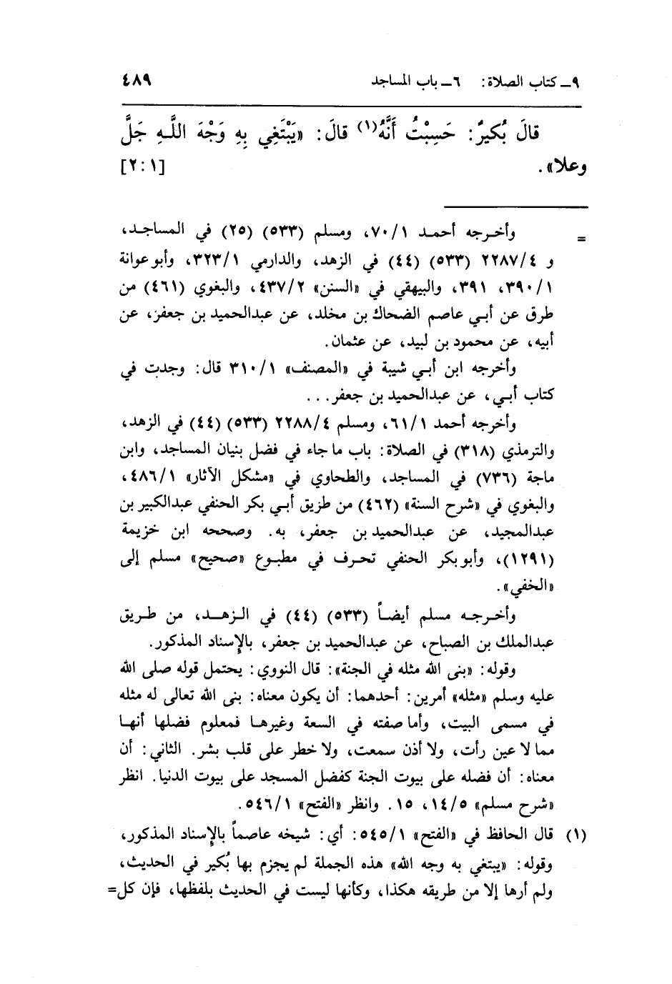 1 قال الحافظ في "الفتح" 1/545: أي: شيخه عاصماً بالإسناد المذكور، وقوله: "يبتغي به وجه الله" هذه الجملة لم يجزم بها بكير في الحديث، ولم أرها إلا من طريقه هكذا، وكأنها ليست في الحديث بلفظها، فإن كل من روى حديث عثمان من جميع الطرق إليه، لفظهم: "من بنى لله مسجداً"، فكأن بكيراً نسيها، فذكرها بالمعنى متردداً في اللفظ الذي ظنه، فإن قوله "لله" بمعنى قوله: "يبتغي وجه الله" لاشتراكهما في المعنى المراد، وهو الإخلاص.