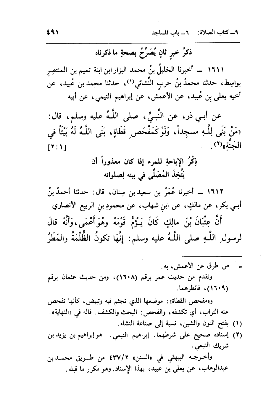 1612- أَخْبَرَنَا عُمَرُ بْنُ سَعِيدِ بْنِ سِنَانٍ قَالَ حَدَّثَنَا أَحْمَدُ بْنُ أَبِي بَكْرٍ عَنْ مَالِكٍ عن بن شِهَابٍ عَنْ مَحْمُودِ بْنِ الرَّبِيعِ الْأَنْصَارِيِّ
