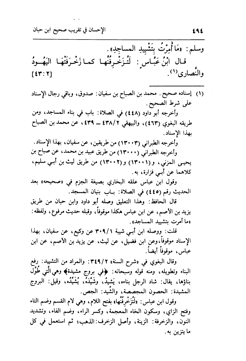 قال الحافظ: وهذا التعليق وصله أبو داود وابن حبان من طريق يزيد بن الأصم، عن ابن عباس هكذا موقوفاً، وقبله حديث مرفوع، ولفظه: "ما أمرت بتشييد المساجد".