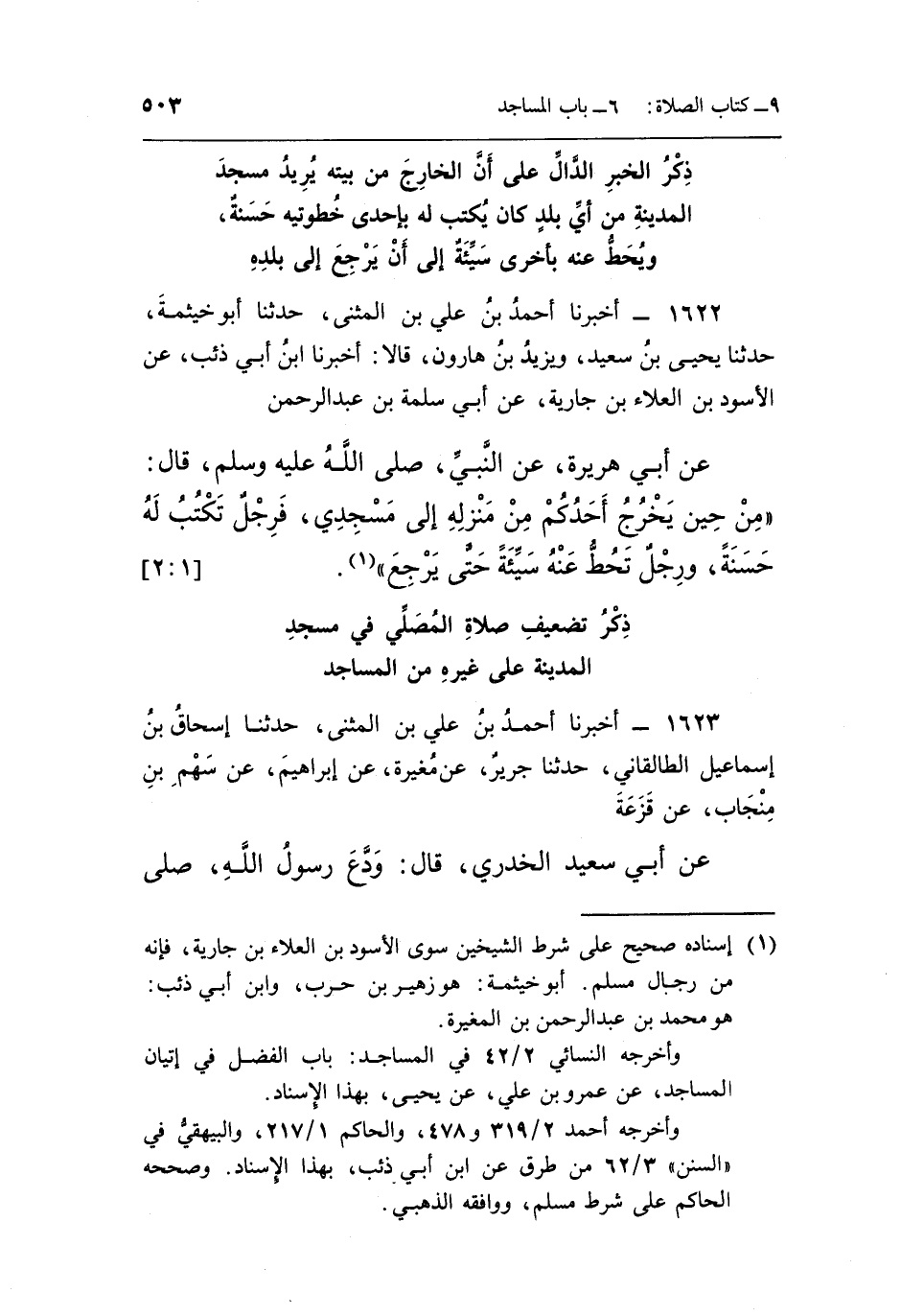 عَنْ أَبِي هُرَيْرَةَ عَنِ النَّبِيِّ صَلَّى اللَّهُ عَلَيْهِ وَسَلَّمَ قَالَ: "مِنْ حِينِ يَخْرُجُ أَحَدُكُمْ مِنْ مَنْزِلِهِ إِلَى مَسْجِدِي فَرِجْلٌ تَكْتُبُ لَهُ حَسَنَةً وَرِجْلٌ تَحُطُّ عَنْهُ سَيِّئَةً حَتَّى يَرْجِعَ" 1.