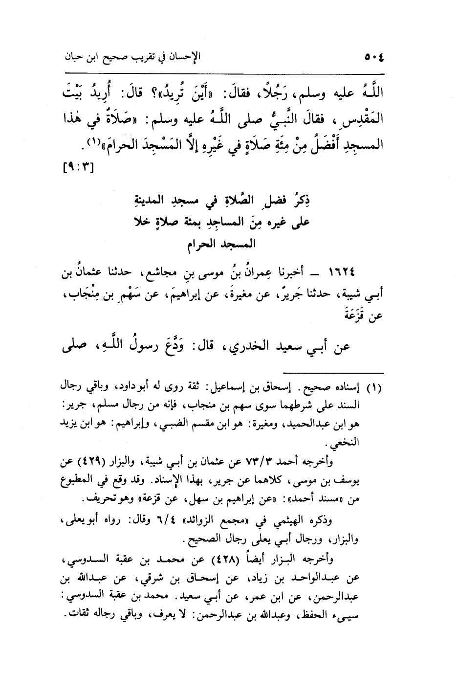 اللَّهُ عَلَيْهِ وَسَلَّمَ رَجُلًا فَقَالَ: "أَيْنَ تُرِيدُ"؟ قَالَ أُرِيدُ بَيْتَ الْمَقْدِسِ فَقَالَ النَّبِيُّ صَلَّى اللَّهُ عَلَيْهِ وَسَلَّمَ: "صَلَاةٌ فِي هَذَا الْمَسْجِدِ أَفْضَلُ مِنْ مِائَةِ صَلَاةٍ فِي غَيْرِهِ إِلَّا المسجد الحرام" 1.
