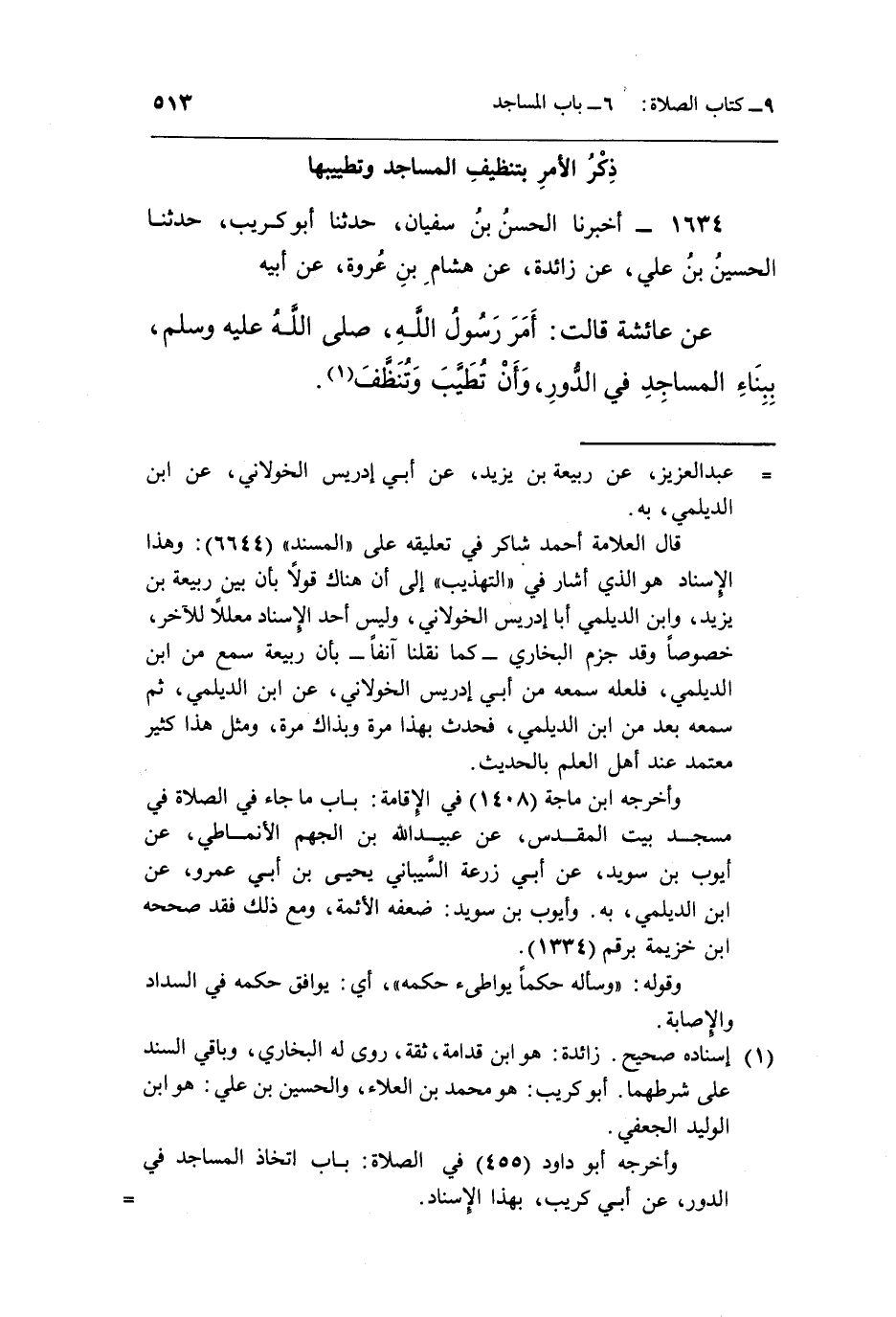 1634- أَخْبَرَنَا الْحَسَنُ بْنُ سُفْيَانَ حَدَّثَنَا أَبُو كُرَيْبٍ حَدَّثَنَا الْحُسَيْنُ بْنُ عَلِيٍّ عَنْ زَائِدَةَ عَنْ هِشَامِ بْنِ عُرْوَةَ عَنْ أَبِيهِ