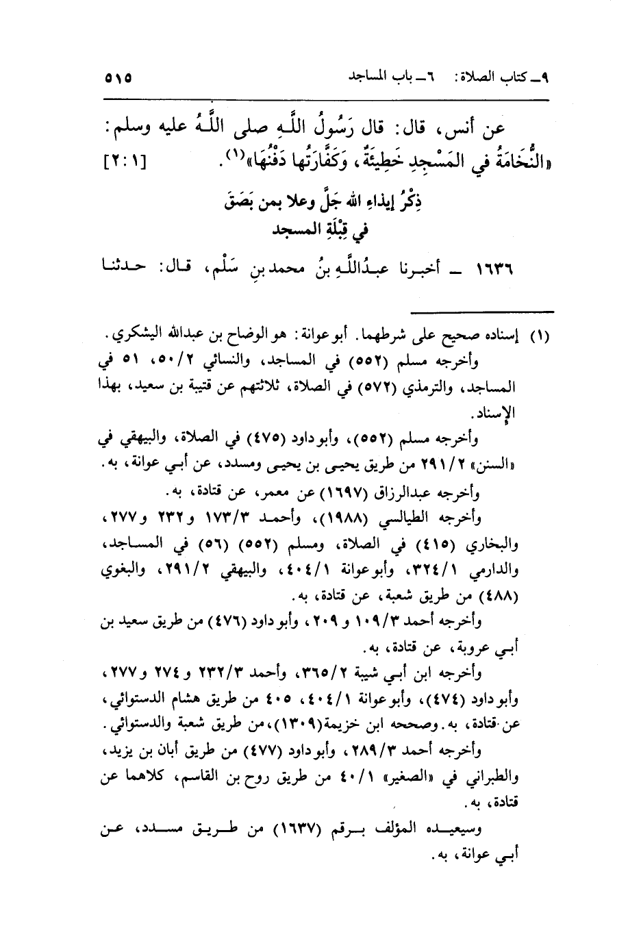 عَنْ أَنَسٍ قَالَ: قَالَ رَسُولُ اللَّهِ صَلَّى اللَّهُ عَلَيْهِ وَسَلَّمَ: "النُّخَامَةُ فِي الْمَسْجِدِ خَطِيئَةٌ وكفارتها دفنها" 1.