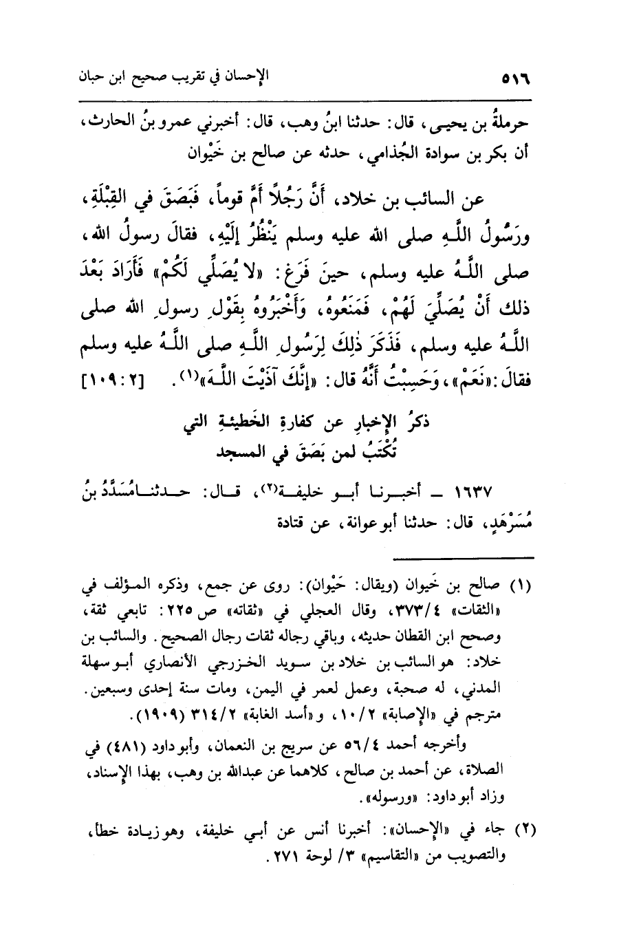 عَنِ السَّائِبِ بْنِ خَلَّادٍ أَنَّ رَجُلًا أَمَّ قَوْمًا فَبَصَقَ فِي الْقِبْلَةِ وَرَسُولُ اللَّهِ صَلَّى اللَّهُ عَلَيْهِ وَسَلَّمَ يَنْظُرُ إِلَيْهِ فَقَالَ رَسُولُ اللَّهِ صَلَّى اللَّهُ عَلَيْهِ وَسَلَّمَ حِينَ فَرَغَ: "لَا يُصَلِّي لَكُمْ" فَأَرَادَ بَعْدَ ذَلِكَ أَنْ يُصَلِّيَ لَهُمْ فَمَنَعُوهُ وَأَخْبَرُوهُ بِقَوْلِ رَسُولِ اللَّهِ صَلَّى اللَّهُ عَلَيْهِ وَسَلَّمَ فَذُكِرَ ذَلِكَ لِرَسُولِ اللَّهِ صَلَّى اللَّهُ عَلَيْهِ وَسَلَّمَ فقَالَ: "نَعَمْ"، وَحَسِبْتُ أَنَّهُ قَالَ: "إِنَّكَ آذَيْتَ الله" 1.
