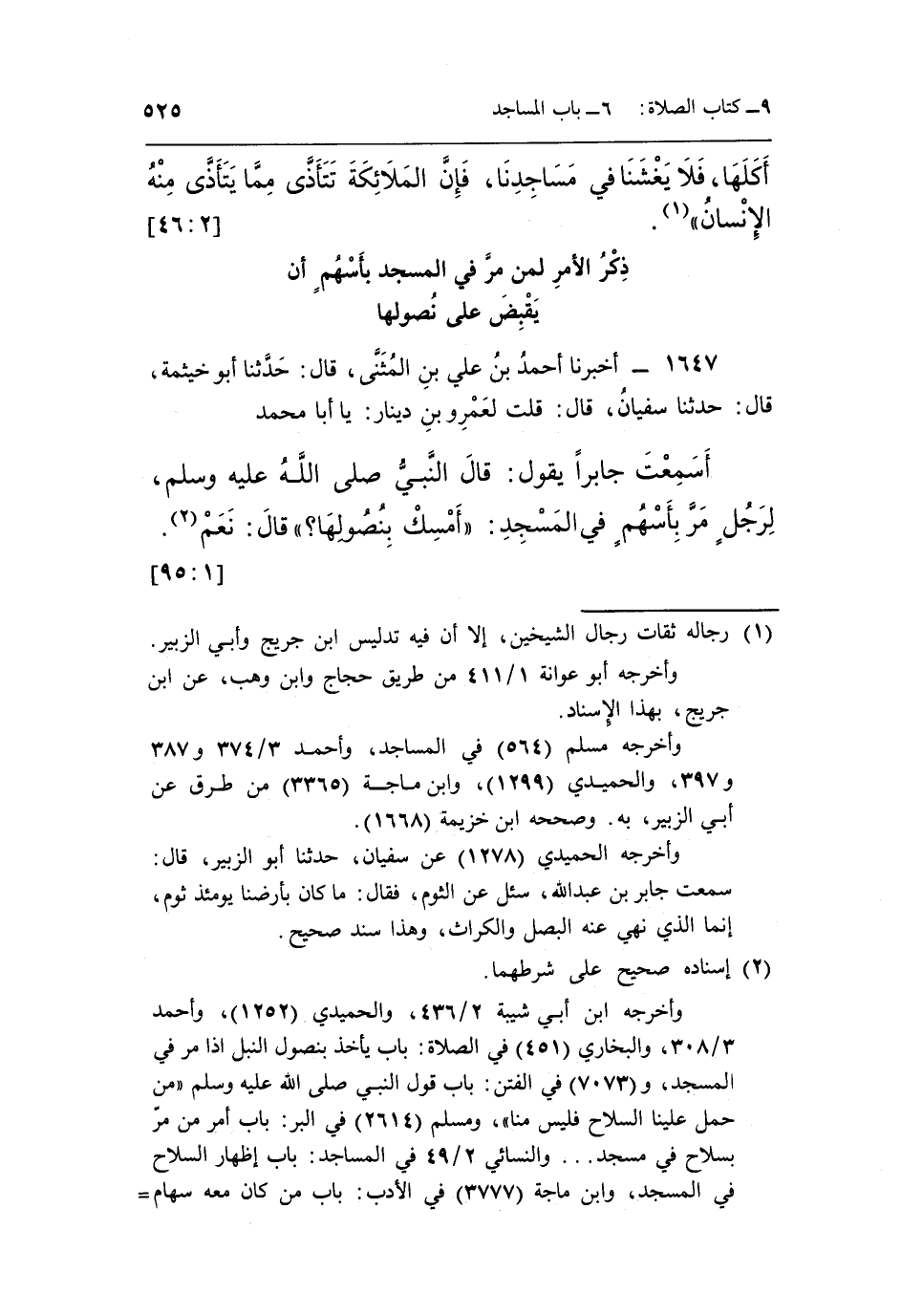 أَسَمِعْتَ جَابِرًا يَقُولُ قَالَ النَّبِيُّ صَلَّى اللَّهُ عَلَيْهِ وَسَلَّمَ لِرَجُلٍ مَرَّ بِأْسَهُمٍ فِي الْمَسْجِدِ: "أَمْسِكْ بِنُصُولِهَا؟ " قَالَ: نعم 1.