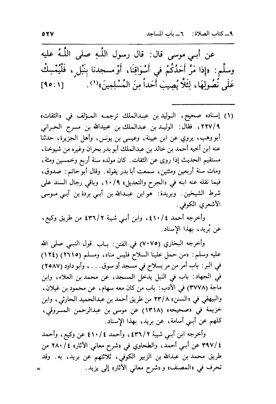 عَنْ أَبِي مُوسَى قَالَ قَالَ رَسُولُ اللَّهِ صَلَّى اللَّهُ عَلَيْهِ وَسَلَّمَ: "إِذَا مَرَّ أَحَدُكُمْ فِي أَسْوَاقِنَا أَوْ مَسْجِدِنَا بِنَبْلٍ فَلْيُمْسِكْ عَلَى نصولها لئلا يصيب أحدا من المسلمين" 1.