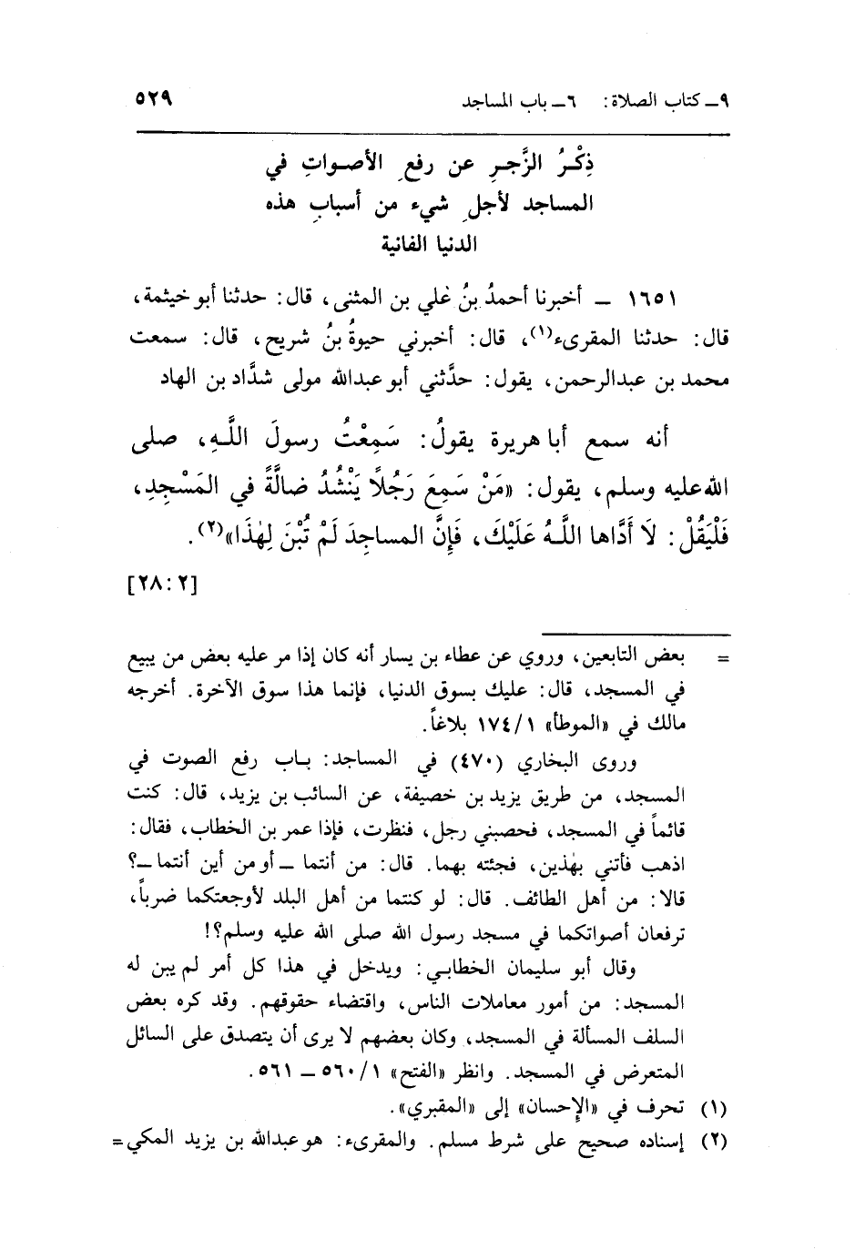 أَنَّهُ سَمِعَ أَبَا هُرَيْرَةَ يَقُولُ سَمِعْتُ رَسُولَ اللَّهِ صَلَّى اللَّهُ عَلَيْهِ وَسَلَّمَ يَقُولُ: "مَنْ سَمِعَ رَجُلًا يَنْشُدُ ضَالَّةً فِي الْمَسْجِدِ فَلْيَقُلْ لَا أَدَّاهَا اللَّهُ عَلَيْكَ فَإِنَّ الْمَسَاجِدَ لَمْ تُبْنَ لهذا" 2.