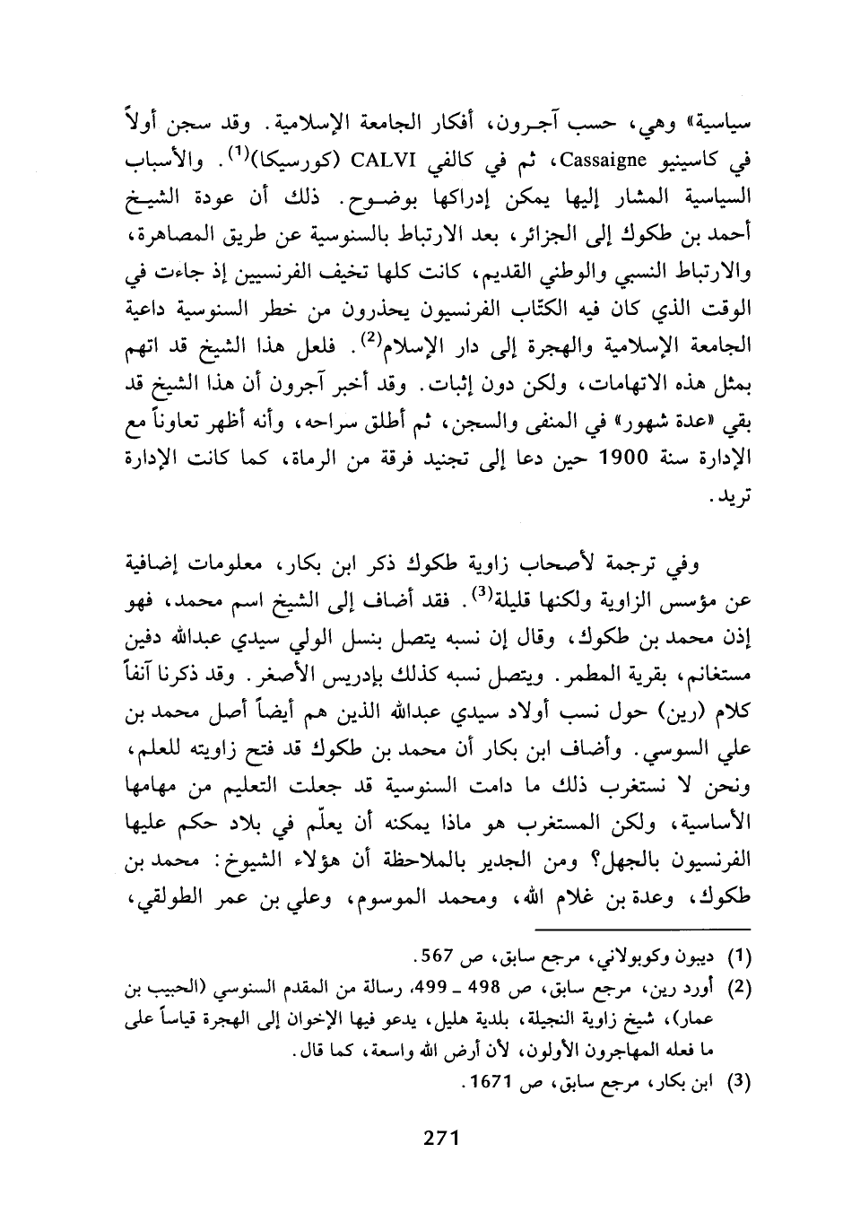 سياسية لا وهي، حسب آجرون، أفكار الجامعة الإسلامية، وقد سجن أولا في كاسينيو Cassaigne، ثم في كالفي CALVI (كورسيكا) (¬1). والأسباب السياسية المشار إليها يمكن إدراكها بوضوح، ذلك أن عودة الشيخ أحمد بن طكوك إلى الجزائر، بعد الارتباط بالسنوسية عن طريق المصاهرة، والارتباط النسبي والوطني القديم، كانت كلها تخيف الفرنسيين إذ جاءت في الوقت الذي كان فيه الكتاب الفرنسيون يحذرون من خطر السنوسية داعية الجامعة الإسلامية والهجرة إلى دار الإسلام (¬2). فلعل هذا الشيخ قد اتهم بمثل هذه الاتهامات، ولكن دون إثبات، وقد أخبر آجرون أن هذا الشيخ قد بقي (عدة شهور) في المنفى والسجن، ثم أطلق سراحه، وأنه أظهر تعاونا مع الإدارة سنة 1900 حين دعا إلى تجنيد فرقة من الرماة، كما كانت الإدارة تريد.
