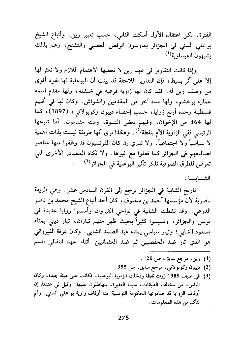 الفترة، لكن اعتقال الأول أسكت الثاني، حسب تعبير رين، وأتباع الشيخ بوعلي السني في الجزائر يمارسون الرقص العصبي والتشنج، وهم بذلك يشبهون العيساوية (¬1).