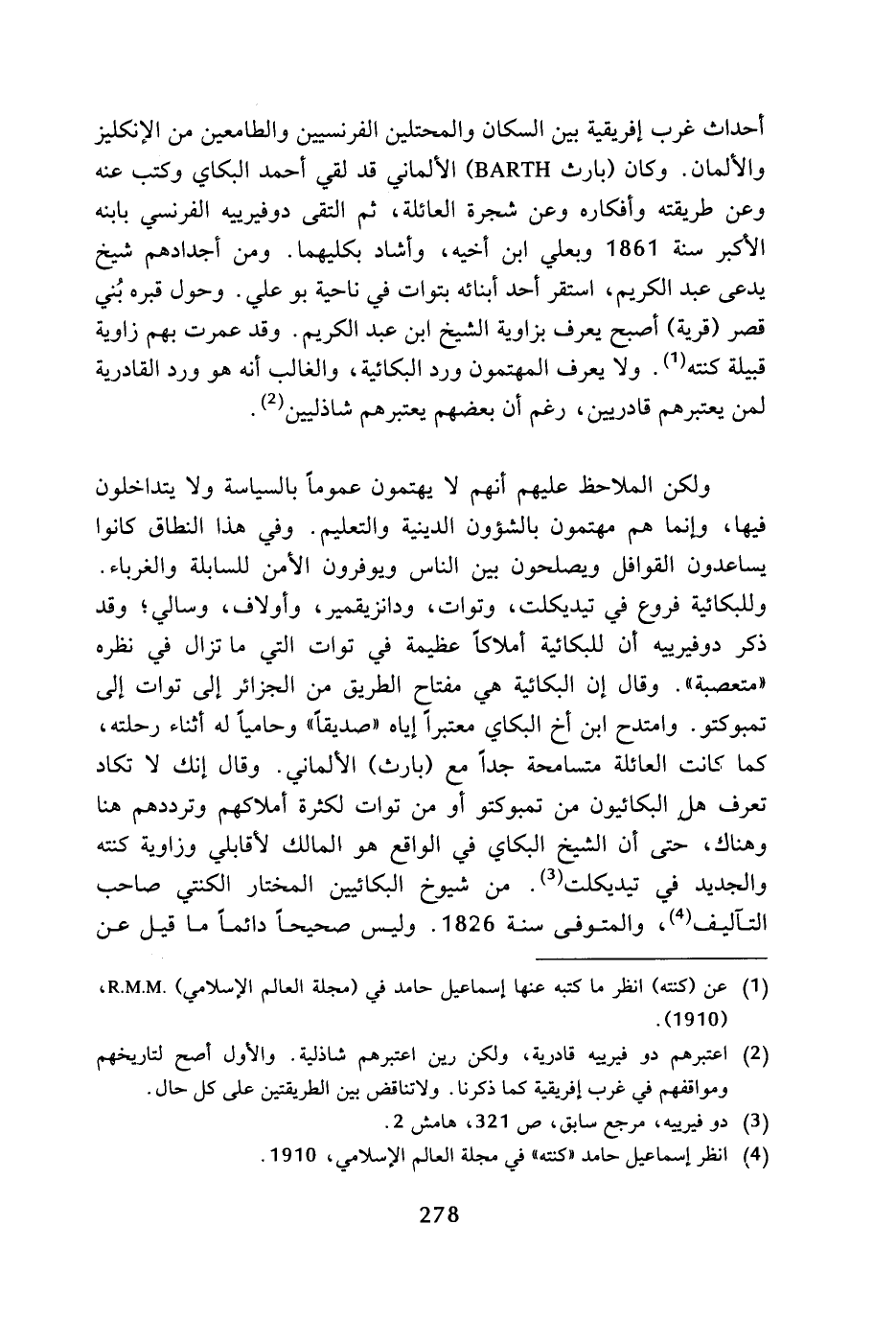 (¬2) اعتبرهم دو فيرييه قادرية، ولكن رين اعتبرهم شاذلية، والأول أصح لتاريخهم ومواقفهم في غرب إفريقية كما ذكرنا، ولاتناقض بين الطريقتين على كل حال.