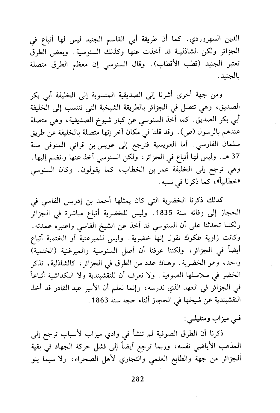 ومن جهة أخرى أشرنا إلى الصديقية المنسوبة إلى الخليفة أبي بكر الصديق، وهي تتصل في الجزائر بالطريقة الشيخية التي تنتسب إلى الخليفة أبي بكر الصديق، كما أخذ السنوسي عن كبار شيوخ الصديقية، وهي متصلة عندهم بالرسول (صلى الله عليه وسلم). وقد قلنا في مكان آخر إنها متصلة بالخليفة عن طريق سلمان الفارسي، أما العويسية فترجع إلى عويس بن قرآني المتوفى سنة 37 هـ، وليس لها أتباع في الجزائر، ولكن السنوسي أخذ عنها وانضم إليها، وهي ترجع إلى الخليفة عمر بن الخطاب، كما يقولون، وكان السنوسي (خطابيا). كما ذكرنا في نسبه.