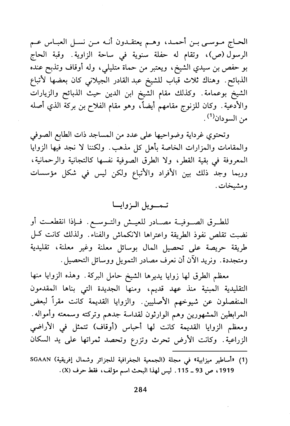 للطرق الصوفية مصادر للعيش والتوسع، فإذا انقطعت أو نضبت تقلص نفوذ الطريقة واعتراها الانكماش والفناء، ولذلك كانت كل طريقة حريصة على تحصيل المال بوسائل معلنة وغير معلنة، تقليدية ومتجددة، ونريد الآن أن نعرف مصادر التمويل ووسائل التحصيل.