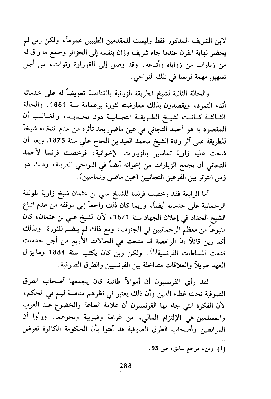 لابن الشريف المذكور فقط وليست للمقدمين الطيبين عموما، ولكن رين لم يحضر نهاية القرن عندما جاء شريف وزان بنفسه إلى الجزائر وجمع ما راق له من زيارات من زواياه وأتباعه، وقد وصل إلى القورارة وتوات، من أجل تسهيل مهمة فرنسا في تلك النواحي.
