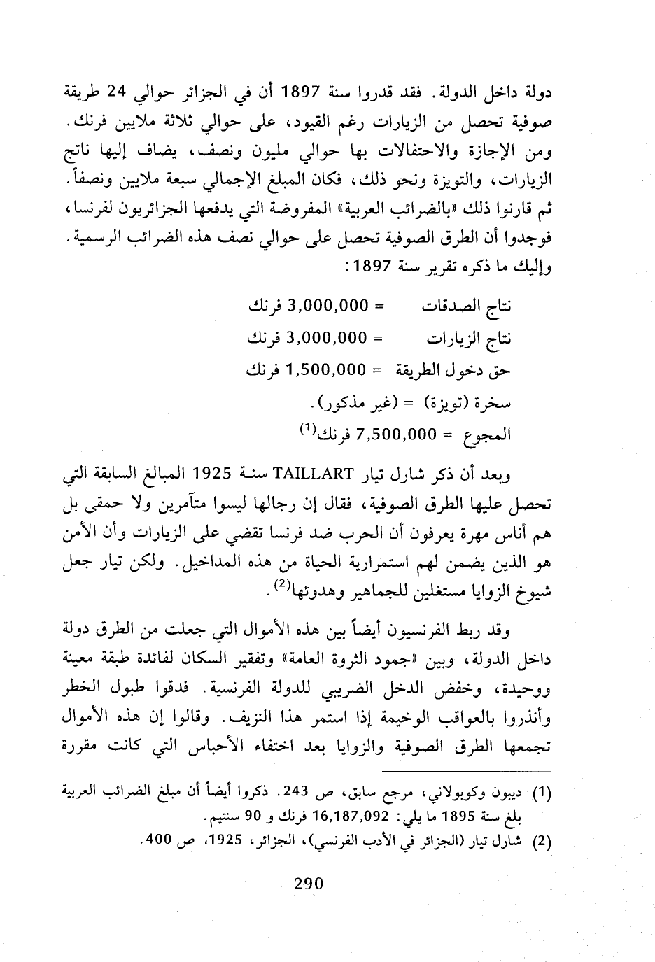 (¬1) ديبون وكوبولاني، مرجع سابق، ص 243، ذكروا أيضا أن مبلغ الضرائب العربية بلغ سنة 1895 ما يلي: 16، 187، 092 فرنك و 90 سنتيم.