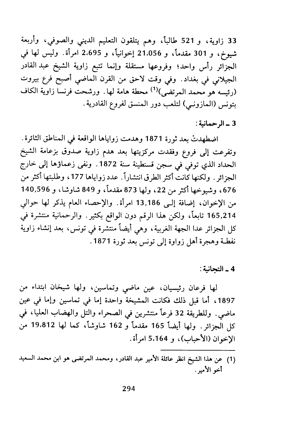 33 زاوية، و 521 طالبا، وهم يتلقون التعليم الديني والصوفي، وأربعة شيوخ، و 301 مقدما، و 21، 056 إخوانيا، و 2، 695 امرأة، وليس لها في الجزائر رأس واحدة وفروعها مستقلة وإنما تتبع زاوية الشيخ عبد القادر الجيلاني في بغداد، وفي وقت لاحق من القرن الماضي أصبح فرع بيروت (رئيسه هو محمد المرتضى) (¬1) محطة هامة لها، ورشحت فرنسا زاوية الكاف بتونس (المازوني) لتلعب دور المنسق لفروع القادرية.