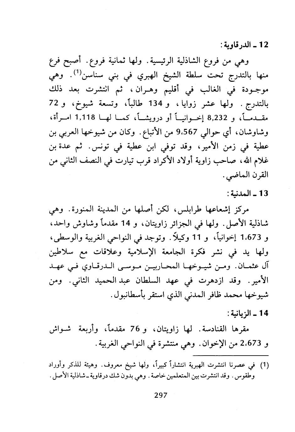 وهي من فروع الشاذلية الرئيسية، ولها ثمانية فروع، أصبح فرع منها بالتدرج تحت سلطة الشيخ الهبري في بني سناسن (¬1). وهي موجودة في الغالب في أقليم وهران، ثم انتشرت بعد ذلك بالتدرج، ولها عشر زوايا، و 134 طالبا، وتسعة شيوخ، و 72 مقدما، و 8، 232 إخوانيا أو درويشا، كما لها 1، 118 امرأة، وشاوشان، أي حوالي 9، 567 من الأتباع، وكان من شيوخها العربي بن عطية في زمن الأمير، وقد توفي ابن عطية في تونس، ثم عدة بن غلام الله، صاحب زاوية أولاد الأكراد قرب تيارت في النصف الثاني من القرن الماضي.