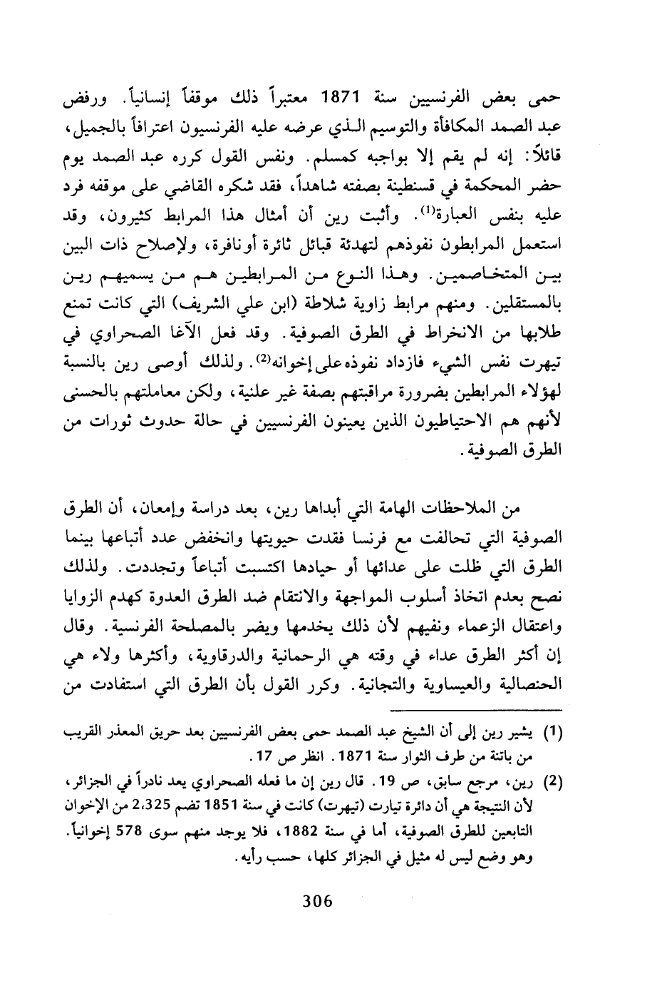 حمى بعض الفرنسيين سنة 1871 معتبرا ذلك موقفا إنسانيا، ورفض عبد الصمد المكافاة والتوسيم الذي عرضه عليه الفرنسيون اعترافا بالجميل، قائلا: إنه لم يقم إلا بواجبه كمسلم، ونفس القول كرره عبد الصمد يوم حضر المحكمة في قسنطينة بصفته شاهدا، فقد شكره القاضي على موقفه فرد عليه بنفس العبارة (¬1). وأثبت رين أن أمثال هذا المرابط كثيرون، وقد استعمل المرابطون نفوذهم لتهدئة قبائل ثائرة أو نافرة، ولإصلاح ذات البين بين المتخاصمين، وهذا النوع من المرابطين هم من يسميهم رين بالمستقلين، ومنهم مرابط زاوية شلاطة (ابن علي الشريف) التي كانت تمنع طلابها من الانخراط في الطرق الصوفية، وقد فعل الآغا الصحراوي في تيهرت نفس الشيء فازداد نفوذه على إخوانه (¬2). ولذلك أوصى رين بالنسبة لهؤلاء المرابطين بضرورة مراقبتهم بصفة غير علنية، ولكن معاملتهم بالحسنى لأنهم هم الاحتياطيون الذين يعينون الفرنسيين في حالة حدوث ثورات من الطرق الصوفية.