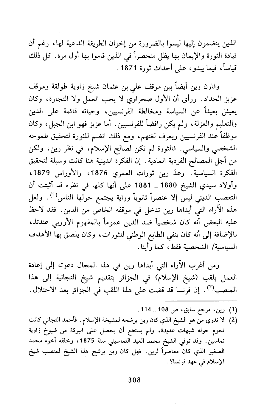 (¬2) لا ندري من هو الشيخ الذي كان رين يرشحه لمشيخة الإسلام، فأحمد التجاني كانت تحوم حوله شبهات عديدة، ولم يستطع أن يحصل على البركة من شيوخ زاوية تماسين، وقد توفي الشيخ محمد العيد التماسيني سنة 1875، وخلفه أخوه محمد الصغير الذي كان معاصرا لرين، فهل كان رين يرشح هذا الشيخ لمنصب شيخ الإسلام في عهد فرنسا؟.