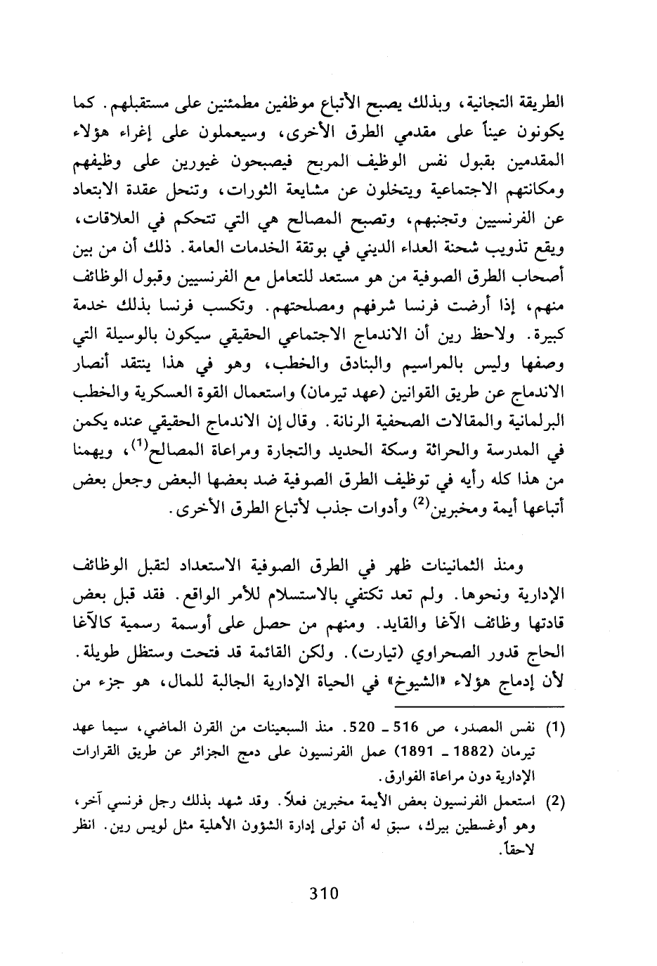 الطريقة التجانية، وبذلك يصبح الأتباع موظفين مطمئنين على مستقبلهم، كما يكونون عينا على مقدمي الطرق الأخرى، وسيعملون على إغراء هؤلاء المقدمين بقبول نفس الوظيف المربح فيصبحون غيورين على وظيفهم ومكانتهم الاجتماعية ويتخلون عن مشايعة الثورات، وتنحل عقدة الابتعاد عن الفرنسيين وتجنبهم، وتصبح المصالح هي التي تتحكم في العلاقات، ويقع تذويب شحنة العداء الديني في بوتقة الخدمات العامة، ذلك أن من بين أصحاب الطرق الصوفية من هو مستعد للتعامل مع الفرنسيين وقبول الوظائف منهم، إذا أرضت فرنسا شرفهم ومصلحتهم، وتكسب فرنسا بذلك خدمة كبيرة، ولاحظ رين أن الاندماج الاجتماعي الحقيقي سيكون بالوسيلة التي وصفها وليس بالمراسيم والبنادق والخعطب، وهو في هذا ينتقد أنصار الاندماج عن طريق القوانين (عهد تيرمان) واستعمال القوة العسكرية والخطب البرلمانية والمقالات الصحفية الرنانة، وقال إن الاندماج الحقيقي عنده يكمن في المدرسة والحراثة وسكة الحديد والتجارة ومراعاة المصالح (¬1). ويهمنا من هذا كله رأيه في توظيف الطرق الصوفية ضد بعضها البعض وجعل بعض أتباعها أيمة ومخبرين (¬2) وأدوات جذب لأتباع الطرق الأخرى.