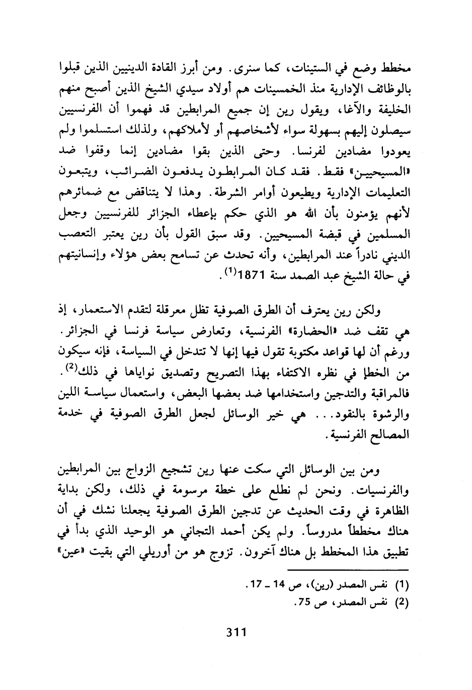 مخطط وضع في الستينات، كما سنرى، ومن أبرز القادة الدينيين الذين قبلوا بالوظائف الإدارية منذ الخمسينات هم أولاد سيدي الشيخ الذين أصبح منهم الخليفة والآغا، ويقول رين إن جميع المرابطين قد فهموا أن الفرنسيين سيصلون إليهم بسهولة سواء لأشخاصهم أو لأملاكهم، ولذلك استسلموا ولم يعودوا مضادين لفرنسا، وحتى الذين بقوا مضادين إنما وقفوا ضد (المسيحيين) فقط، فقد كان المرابطون يدفعون الضرائب، ويتبعون التعليمات الإدارية ويطيعون أوامر الشرطة، وهذا لا يتناقض مع ضمائرهم لأنهم يؤمنون بأن الله هو الذي حكم بإعطاء الجزائر للفرنسيين وجعل المسلمين في قبضة المسيحيين، وقد سبق القول بأن رين يعتبر التعصب الديني نادرا عند المرابطين، وأنه تحدث عن تسامح بعض هؤلاء وإنسانيتهم في حالة الشيخ عبد الصمد سنة 1871 (¬1).