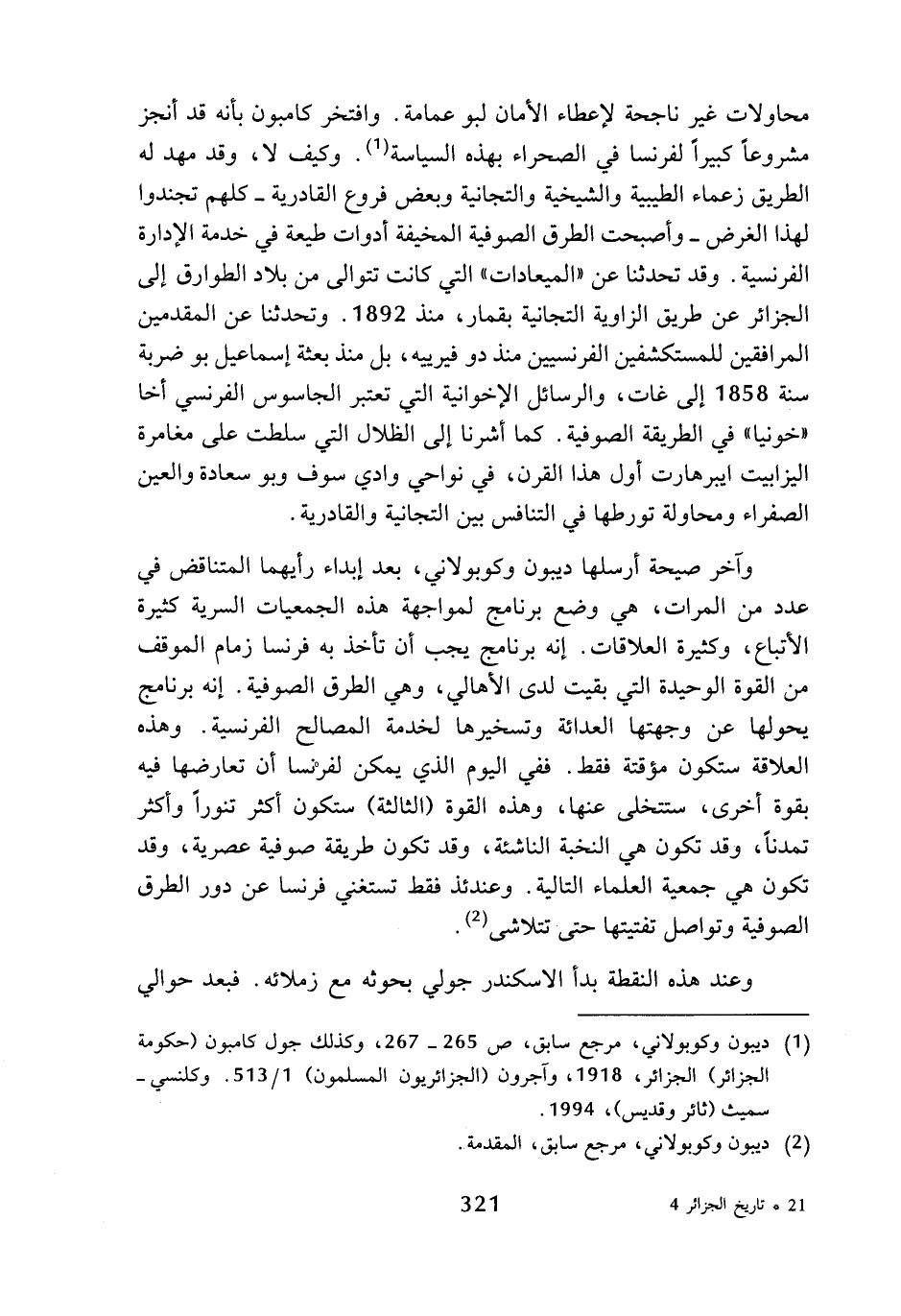 (¬1) ديبون وكوبولاني، مرجع سابق، ص 265 - 267، وكذلك جول كامبون (حكومة الجزائر) الجزائر، 1918، وآجرون (الجزائريون المسلمون) 1/ 513، وكلنسي - سميث (ثائر وقديس)، 1994.