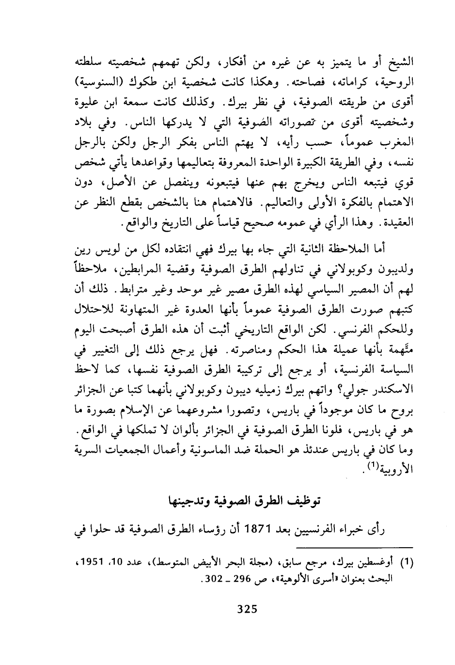أما الملاحظة الثانية التي جاء بها بيرك فهي انتقاده لكل من لويس رين ولديبون وكوبولاني في تناولهم الطرق الصوفية وقضية المرابطين، ملاحظا لهم أن المصير السياسي لهذه الطرق مصير غير موحد وغير مترابط، ذلك أن كتبهم صورت الطرق الصوفية عموما بانها العدوة غير المتهاونة للاحتلال وللحكم الفرنسي، لكن الواقع التاريخي أثبت أن هذه الطرق أصبحت اليوم متهمة بأنها عميلة هذا الحكم ومناصرته، فهل يرجع ذلك إلى التغيير في السياسة الفرنسية، أو يرجع إلى تركيبة الطرق الصوفية نفسها، كما لاحظ الاسكندر جولي؟ واتهم بيرك زميليه ديبون وكوبولاني بأنهما كتبا عن الجزائر بروح ما كان موجودا في باريس، وتصورا مشروعهما عن الإسلام بصورة ما هو في باريس، فلونا الطرق الصوفية في الجزائر بألوان لا تملكها في الواقع، وما كان في باريس عندئذ هو الحملة ضد الماسونية وأعمال الجمعيات السرية الأروبية (¬1).