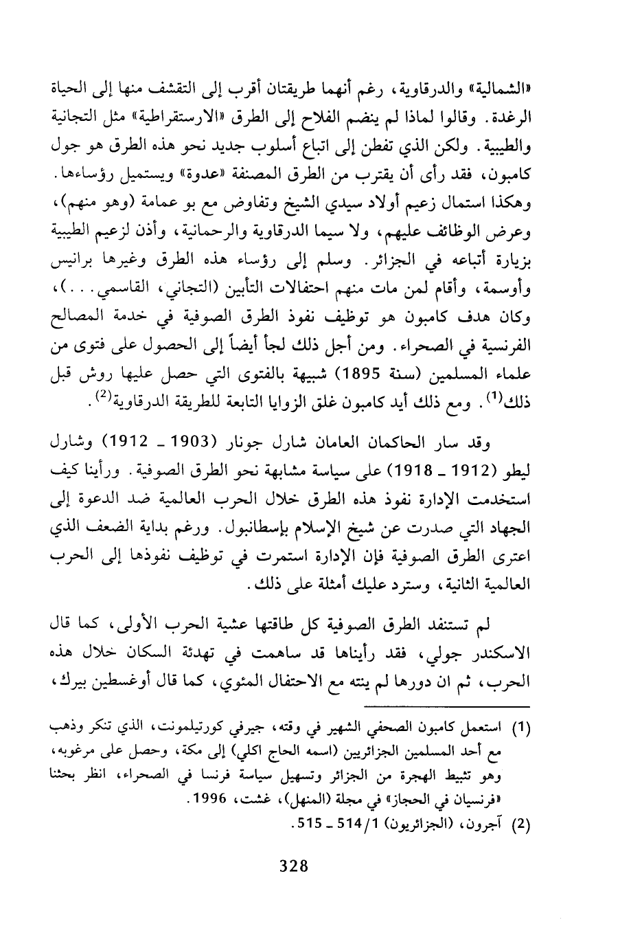 (¬1) استعمل كامبون الصحفي الشهير في وقته، جيرفي كورتيلمونت، الذي تنكر وذهب مع أحد المسلمين الجزائريين (اسمه الحاج اكلي) إلى مكة، وحصل على مرغوبه، وهو تثبيط الهجرة من الجزائر وتسهيل سياسة فرنسا في الصحراء، انظر بحثنا (فرنسيان في الحجاز) في مجلة (المنهل). غشت، 1996.
