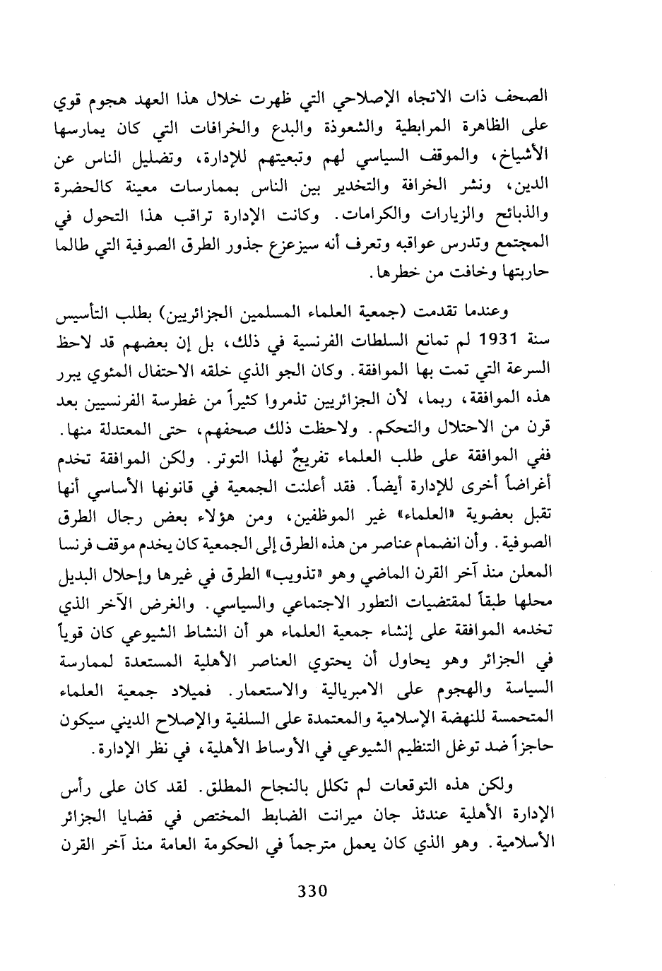وعندما تقدمت (جمعية العلماء المسلمين الجزائريين) بطلب التأسيس سنة 1931 لم تمانع السلطات الفرنسية في ذلك، بل إن بعضهم قد لاحظ السرعة التي تمت بها الموافقة، وكان الجو الذي خلقه الاحتفال المئوي يبرر هذه الموافقة، ربما، لأن الجزائريين تذمروا كثيرا من غطرسة الفرنسيين بعد قرن من الاحتلال والتحكم، ولاحظت ذلك صحفهم، حتى المعتدلة منها، ففي الموافقة على طلب العلماء تفريج لهذا التوتر، ولكن الموافقة تخدم أغراضا أخرى للإدارة أيضا، فقد أعلنت الجمعية في قانونها الأساسي أنها تقبل بعضوية (العلماء) غير الموظفين، ومن هؤلاء بعض رجال الطرق الصوفية، وأن انضمام عناصر من هذه الطرق إلى الجمعية كان يخدم موقف فرنسا المعلن منذ آخر القرن الماضي وهو (تذويب) الطرق في غيرها وإحلال البديل محلها طبقا لمقتضيات التطور الاجتماعي والسياسي، والغرض الآخر الذي تخدمه الموافقة على إنشاء جمعية العلماء هو أن النشاط الشيوعي كان قويا في الجزائر وهو يحاول أن يحتوي العناصر الأهلية المستعدة لممارسة السياسة والهجوم على الامبريالية والاستعمار، فميلاد جمعية العلماء المتحمسة للنهضة الإسلامية والمعتمدة على السلفية والإصلاح الديني سيكون حاجزا ضد توغل التنظيم الشيوعي في الأوساط الأهلية، في نظر الإدارة، ولكن هذه التوقعات لم تكلل بالنجاح المطلق، لقد كان على رأس الإدارة الأهلية عندئذ جان ميرانت الضابط المختص في قضايا الجزائر الإسلامية، وهو الذي كان يعمل مترجما في الحكومة العامة منذ آخر القرن