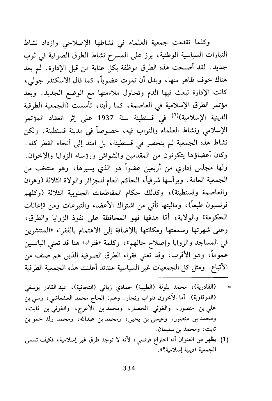 وكلما تقدمت جمعية العلماء في نشاطها الإصلاحي وازداد نشاط التيارات السياسية الوطنية، برز على المسرح نشاط الطرق الصوفية في ثوب جديد، لقد أصبحت هذه الطرق موظفة بكل عناية من قبل الإدارة، لم يعد هناك خوف ظاهر منها، وبدل أن تموت عضويا، كما قال الاسكندر جولي، كانت الإدارة تبعث فيها الدم وتحاول ملاءمتها مع الوضع الجديد، وبعد مؤتمر الطرق الإسلامية في العاصمة، كما رأينا، تأسست (الجمعية الطرقية الدينية الإسلامية) (¬1) في قسنطينة سنة 1937 على إثر انعقاد المؤتمر الإسلامي ونشاط العلماء والنواب فيه، خصوصا في مدينة قسنطينة، ولكن نشاط هذه الجمعية لم ينحصر في قسنطينة، بل امتد إلى أنحاء القطر كله، وكان أعضاؤها يتكونون من المقدمين والشواش ورؤساء الزوايا والإخوان، ولها مجلس إداري من أربعين عضوا هو الذي يسيرها، وهو منتخب من الجمعية العامة، ويرأسها شرفيا، الحاكم العام للجزائر والولاة الثلاثة (وهران والعاصمة وقسنطينة)، وكذلك حكام المقاطعات الجنوبية الثلاثة (وكلهم فرنسيون طبعا). وماليتها تأتي من اشتراك الأعضاء والتبرعات ومن (إعانات الحكومة) والولاية، أما هدفها فهو المحافظة على نفوذ الزوايا والطرق، وعلى شهرتها وسمعتها ومكانتها بالإضافة إلى الاهتمام بالفقراء (المنتشرين في المساجد والزوايا وإصلاح حالهم)، وكلمة (فقراء) هنا قد تعني البائسين عموما، وهو الأقرب، وقد تعني فقراء الطرق الصوفية الذين هم صنف من الأتباع. ومثل كل الجمعيات غير السياسية عندئذ أعلنت هذه الجمعية الطرقية
