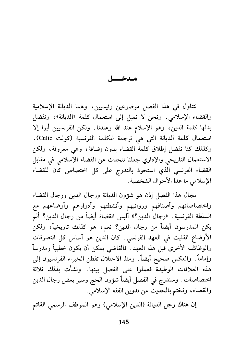 نتناول في هذا الفصل موضوعين رئيسيين، وهما الديانة الإسلامية والقضاء الإسلامي، ونحن لا نميل إلى استعمال كلمة (الديانة)، ونفضل بدلها كلمة الدين، وهو الإسلام عند الله وعندنا، ولكن الفرنسيين أبوا إلا استعمال كلمة الديانة التي هي ترجمة للكلمة الفرنسية (Culte). وكذلك كنا نفضل إطلاق كلمة القضاء بدون إضافة، وهي معروفة، ولكن الاستعمال التاريخي والإداري جعلنا نتحدث عن القضاء الإسلامي في مقابل القضاء الفرنسي الذي استحوذ بالتدرج على كل اختصاص كان للقضاء الإسلامي ما عدا الأحوال الشخصية.