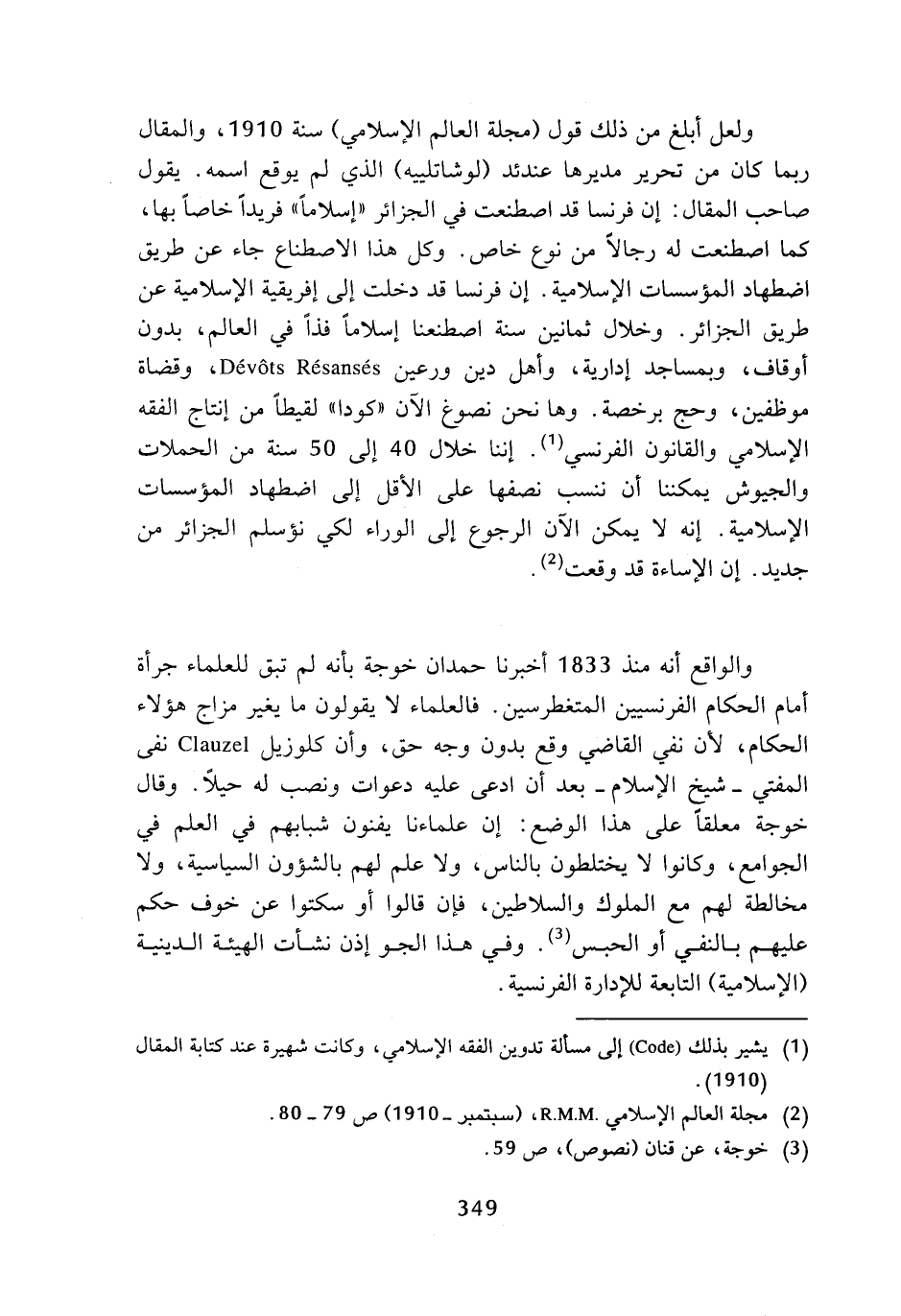ولعل أبلغ من ذلك قول (مجلة العالم الإسلامي) سنة 1910، والمقال ربما كان من تحرير مديرها عندئد (لوشاتلييه) الذي لم يوقع اسمه. يقول صاحب المقال: إن فرنسا قد اصطنعت في الجزائر (إسلاما) فريدا خاصا بهما، كما اصطنعت له رجالا من نوع خاص، وكل هذا الاصطناع جاء عن طريق اضطهاد المؤسسات الإسلامية، إن فرنسا قد دخلت إلى إفريقية الإسلامية عن طريق الجزائر. وخلال ثمانين سنة اصطنعنا إسلاما فذا في العالم، بدون أوقاف، وبمساجد إدارية، وأهل دين ورعين Dévôt Résansés، وقضاة موظفين، وحج برخصة، وها نحن نصوغ الآن (كودا) لقيطا من إنتاج الفقه الإسلامي والقانون الفرنسي (¬1). إننا خلال 40 إلى 50 سنة من الحملات والجيوش يمكننا أن ننسب نصفها على الأقل إلى اضطهاد المؤسسات الإسلامية، إنه لا يمكن الآن الرجوع إلى الوراء لكي نؤسلم الجزائر من جديد، إن الإساءة قد وقعت (¬2).