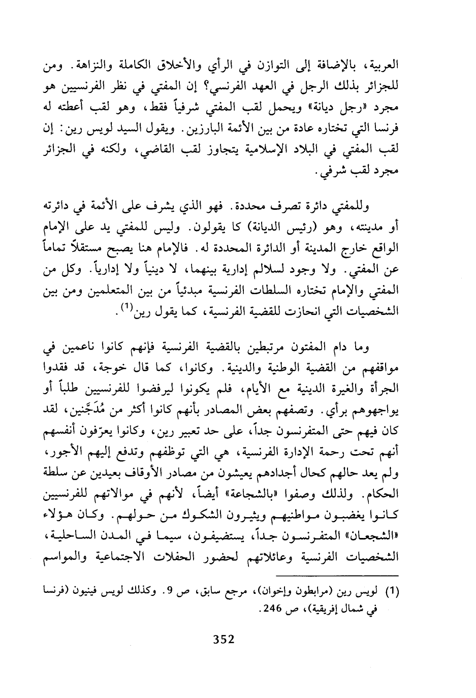 العربية، بالإضافة إلى التوازن في الرأي والأخلاق الكاملة والنزاهة، ومن للجزائر بذلك الرجل في العهد الفرنسي؟ إن المفتي في نظر الفرنسيين هو مجرد (رجل ديانة) ويحمل لقب المفتي شرفيا فقط، وهو لقب أعطته له فرنسا التي تختاره عادة من بين الأئمة البارزين، ويقول السيد لويس رين: إن لقب المفتي في البلاد الإسلامية يتجاوز لقب القاضي، ولكنه في الجزائر مجرد لقب شرفي.