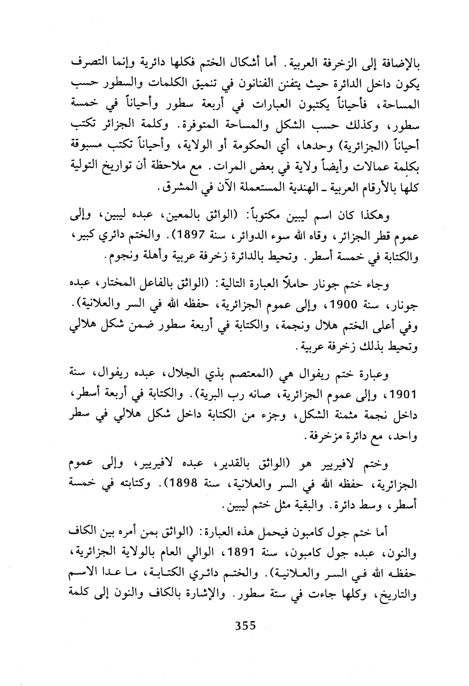 أما ختم جول كامبون فيحمل هذه العبارة: (الواثق بمن أمره بين الكاف والنون، عبده جول كامبون، سنة 1891، الوالي العام بالولاية الجزائرية، حفظه الله في السر والعلانية). والختم دائري الكتابة، ما عدا الاسم والتاريخ، وكلها جاءت في ستة سطور، والإشارة بالكاف والنون إلى كلمة