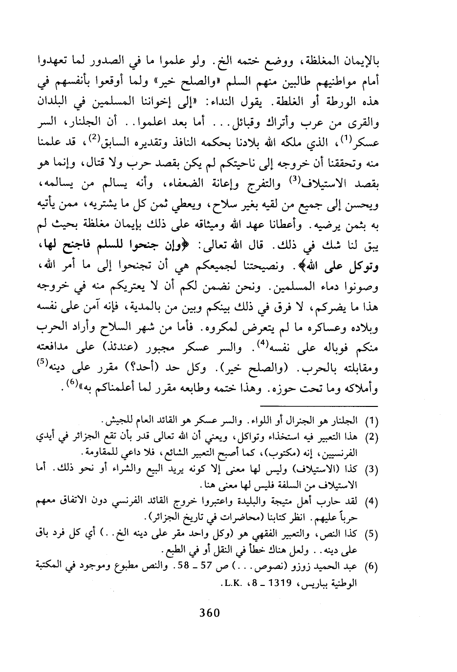 بالإيمان المغلظة، ووضع ختمه الخ، ولو علموا ما في الصدور لما تعهدوا أمام مواطنيهم طالبين منهم السلم (والصلح خير) ولما أوقعوا بأنفسهم في هذه الورطة أو الغلطة، يقول النداء: (إلى إخواننا المسلمين في البلدان والقرى من عرب وأتراك وقبائل ... أما بعد اعلموا .. أن الجلنار، السر عسكر (¬1)، الذي ملكه الله بلادنا بحكمه النافذ وتقديره السابق (¬2)، قد علمنا منه وتحققنا أن خروجه إلى ناحيتكم لم يكن بقصد حرب ولا قتال، وإنما هو بقصد الاستيلاف (¬3) والتفرج وإعانة الضعفاء، وأنه يسالم من يسالمه، ويحسن إلى جميع من لقيه بغير سلاح، ويعطي ثمن كل ما يشتريه، ممن يأتيه به بثمن يرضيه، وأعطانا عهد الله وميثاقه على ذلك بإيمان مغلظة بحيث لم يبق لنا شك في ذلك، قال الله تعالى: {وإن جنحوا للسلم فاجنح لها، وتوكل على الله}. ونصيحتنا لجميعكم هي أن تجنحوا إلى ما أمر الله، وصونوا دماء المسلمين، ونحن نضمن لكم أن لا يعتريكم منه في خروجه هذا ما يضركم، لا فرق في ذلك بينكم وبين من بالمدية، فإنه آمن على نفسه وبلاده وعساكره ما لم يتعرض لمكروه، فأما من شهر السلاح وأراد الحرب منكم فوباله على نفسه (¬4). والسر عسكر مجبور (عندئذ) على مدافعته ومقابلته بالحرب، (والصلح خير). وكل حد (أحد؟) مقرر على دينه (¬5) وأملاكه وما تحت حوزه، وهذا ختمه وطابعه مقرر لما أعلمناكم به) (¬6).