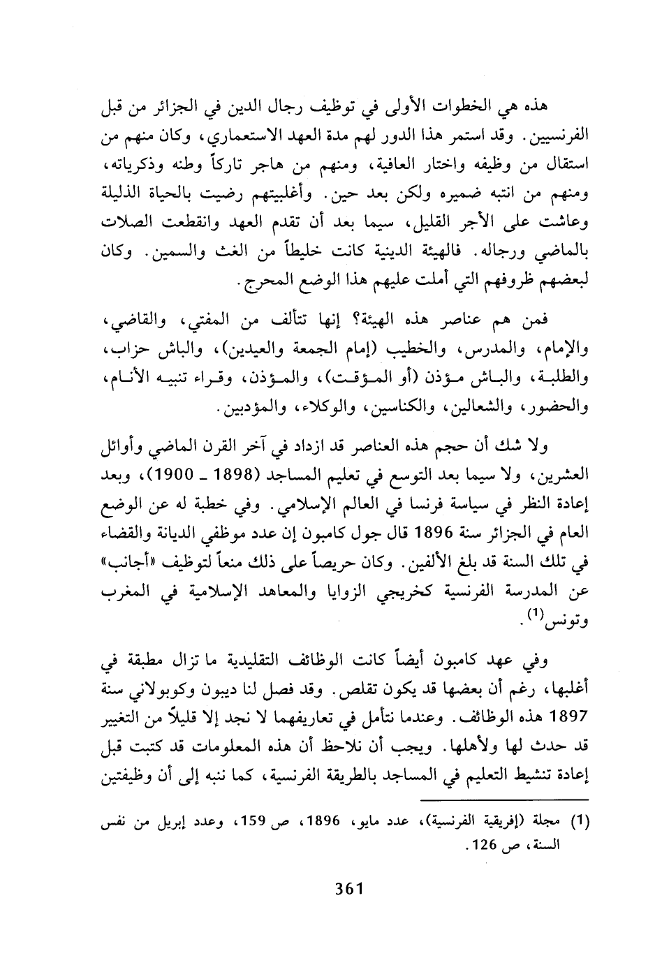 ولا شك أن حجم هذه العناصر قد ازداد في آخر القرن الماضي وأوائل العشرين، ولا سيما بعد التوسع في تعليم المساجد (1898 - 1900). وبعد إعادة النظر في سياسة فرنسا في العالم الإسلامي، وفي خطبة له عن الوضع العام في الجزائر سنة 1896 قال جول كامبون إن عدد موظفي الديانة والقضاء في تلك السنة قد بلغ الألفين، وكان حريصا على ذلك منعا لتوظيف (أجانب) عن المدرسة الفرنسية كخريجي الزوايا والمعاهد الإسلامية في المغرب وتونس (¬1).